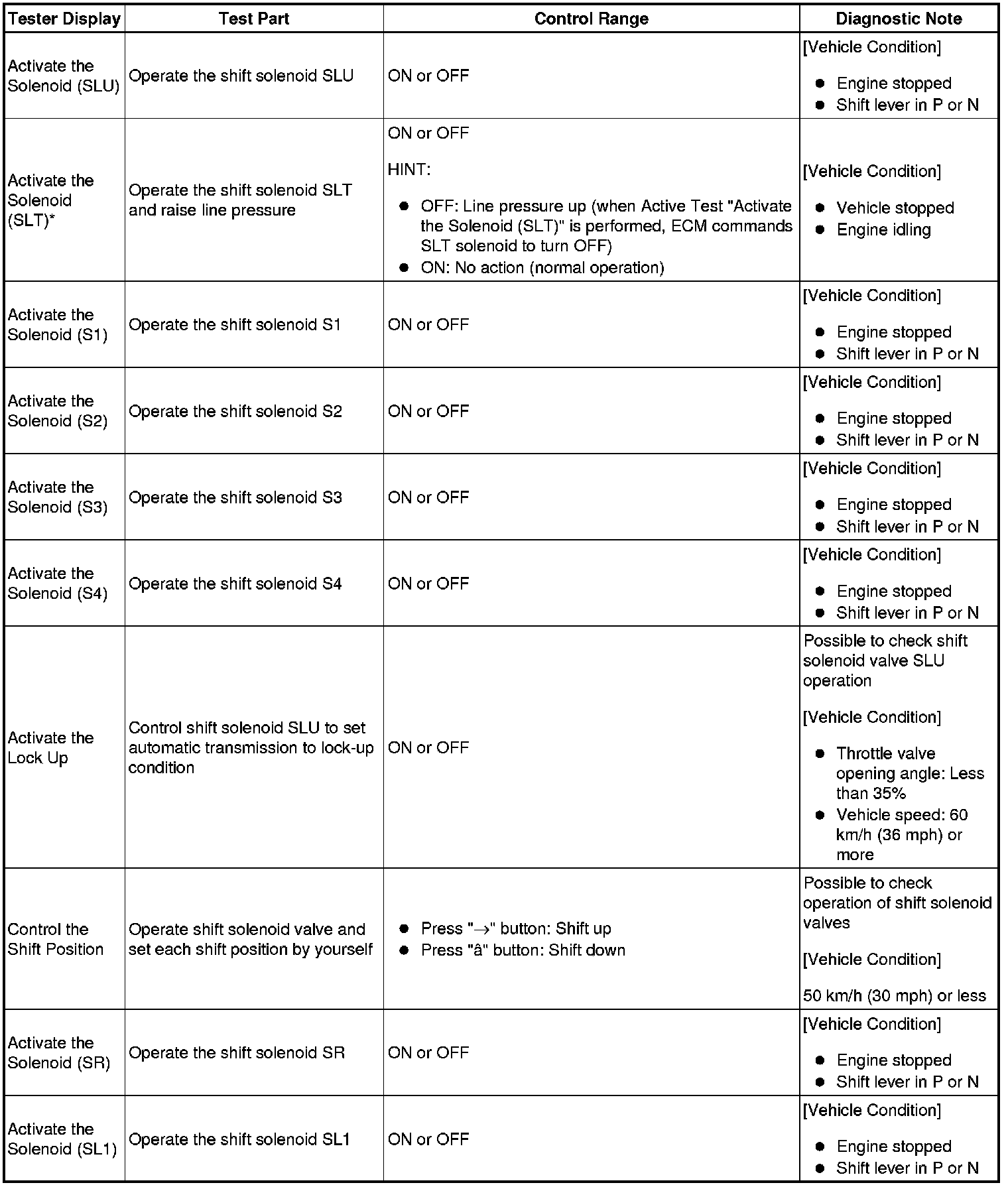 HINT: *: Activate the Solenoid (SLT) in the Active Test is performed to check the line pressure changes by connecting SST to the automatic transmission, which is used in the Hydraulic Test Hydraulic Test as well. Please note that the pressure values in the Active Test and Hydraulic Test are different.