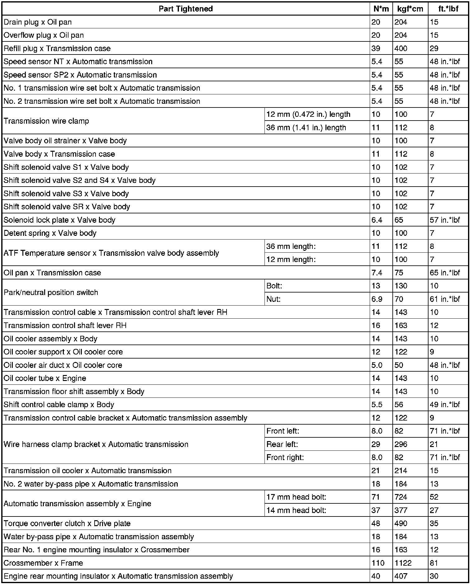 SPECIFICATIONS: AB60F AUTOMATIC TRANSMISSION / TRANSAXLE: TORQUE SPECIFICATIONS