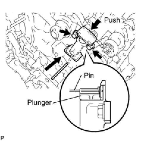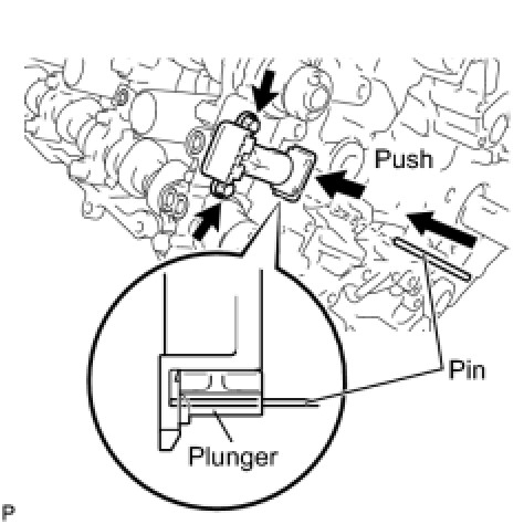 While raising up the No. 2 chain tensioner, insert a pin of dia1.0 mm (0.0394 in.) into the hole to fix it in place
