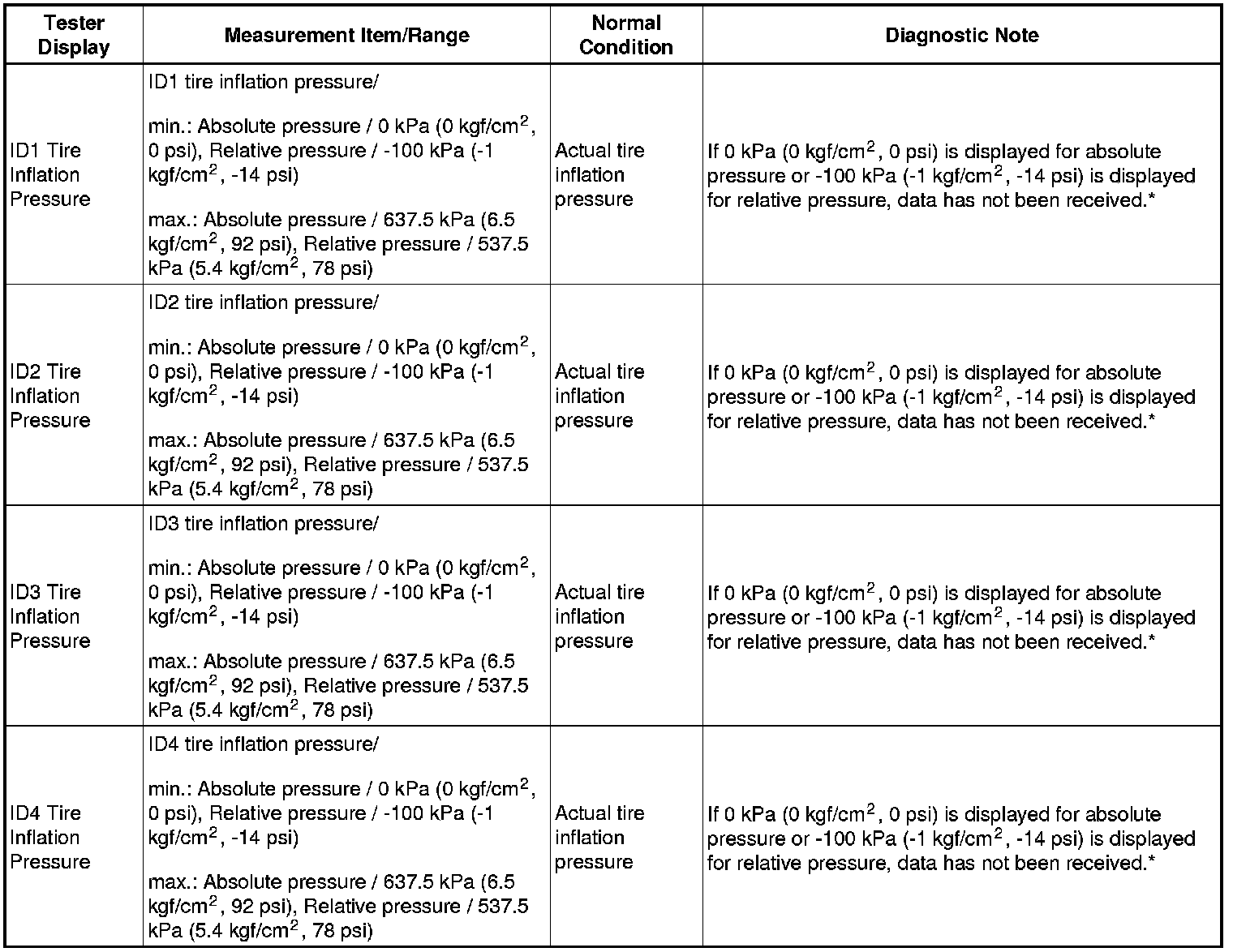 - The initialization is complete when the Data List "ID Tire Inflation Pressure" display shows the correct pressures.
