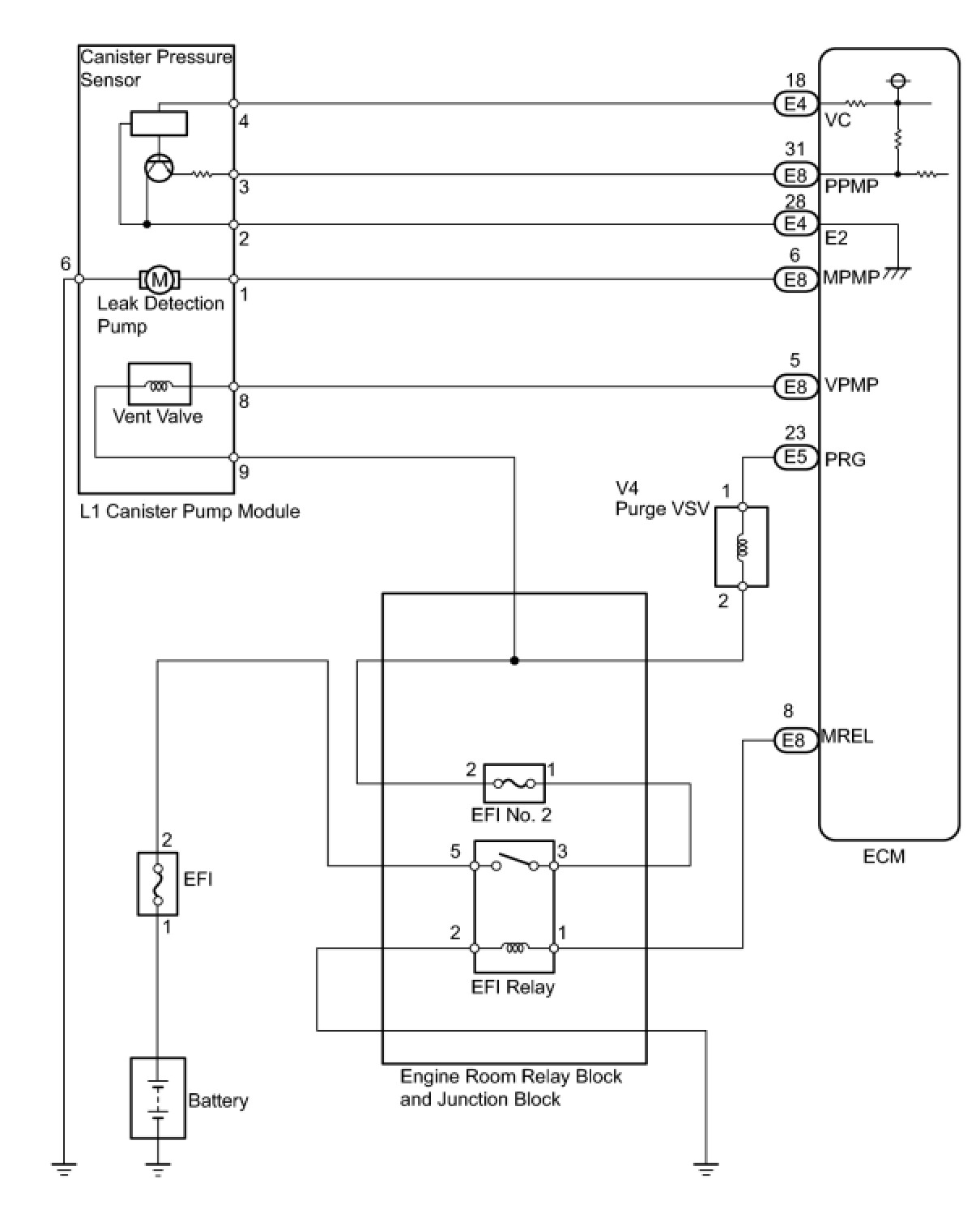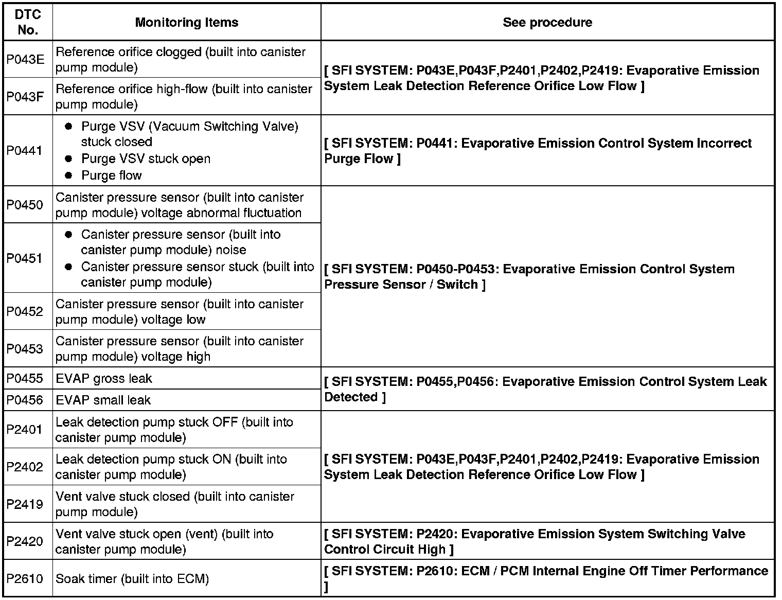 The leak detection pump creates negative pressure (vacuum) in the EVAP system and the pressure is measured. Finally, the ECM monitors for leaks from the EVAP system, and malfunctions in both the canister pump module and purge VSV, based on the EVAP pressure.