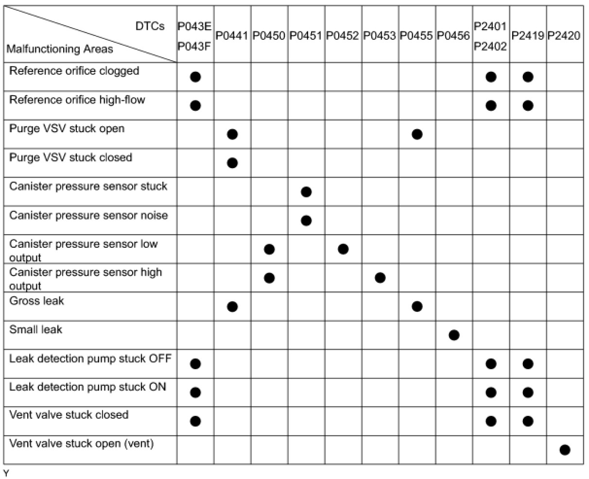 If any EVAP system DTCs are set, the malfunctioning area can be determined using the table below.