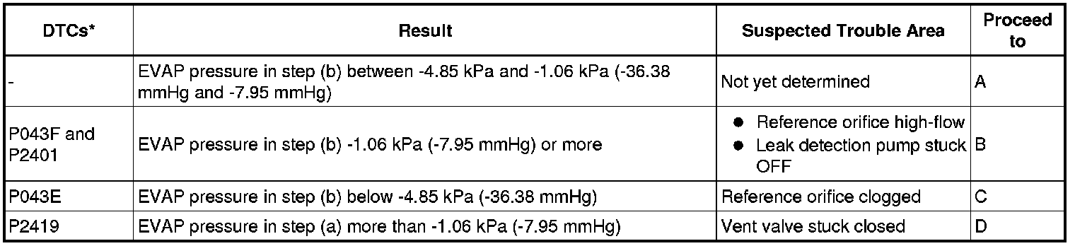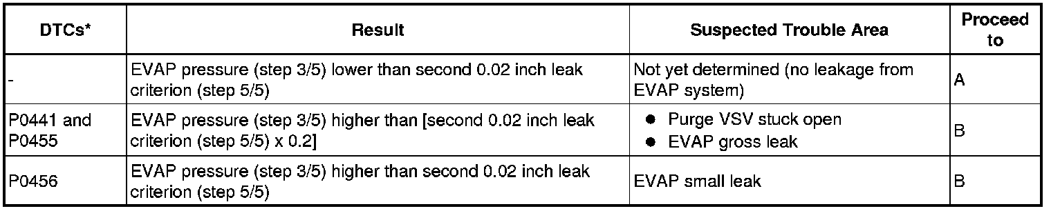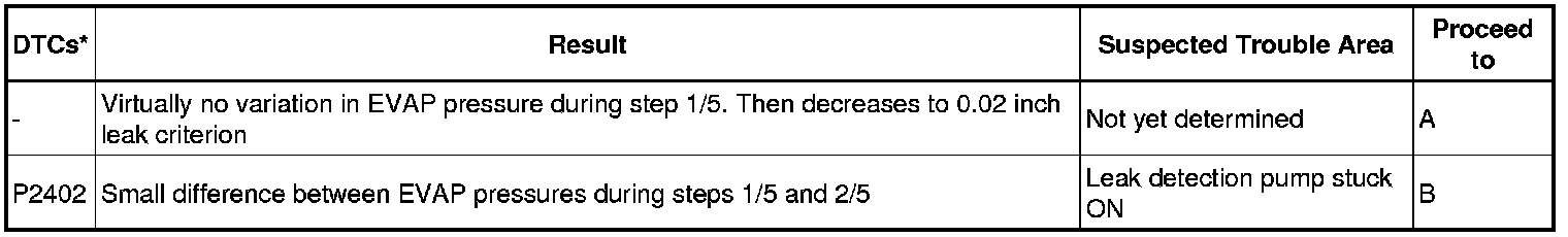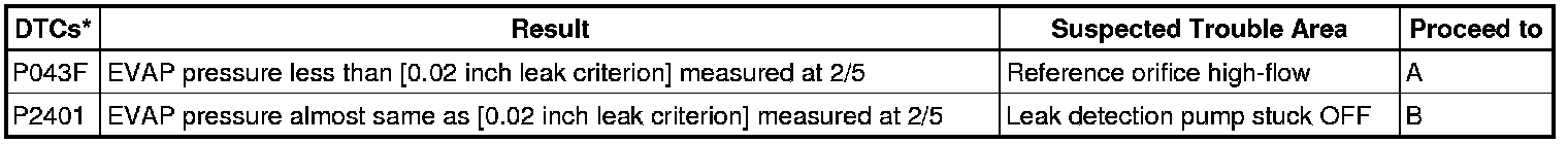 NOTICE: If the 0.02 inch leak criterion difference between the first and second checks is greater than the specification, the DTCs corresponding to the leak criterion (P043E, P043F, P2401, P2402 and P2419) will be all stored.