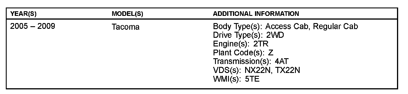 Some customers with 4 cylinder (2TR-FE) and A340 (4-speed) automatic transmission equipped Tacoma vehicles may experience an intermittent shudder or vibration. This condition lasts for approximately one second and occurs when lightly accelerating after an upshift into 3rd or 4th gear with the torque converter assembly in Flex Lockup. This vibration is commonly described as feeling like driving over "rumble strips" or on a "washboard" road. The Engine Control Module/ECM (SAE term: Powertrain Control Module/PCM) logic has been revised to prevent the learning of an incorrect value during certain driving conditions. Use the following repair procedure to address customer concerns.