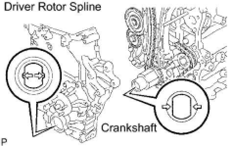 (e) Align the oil pump's drive rotor spline and the crankshaft as shown in the illustration. Install the spline and chain cover onto the crankshaft.