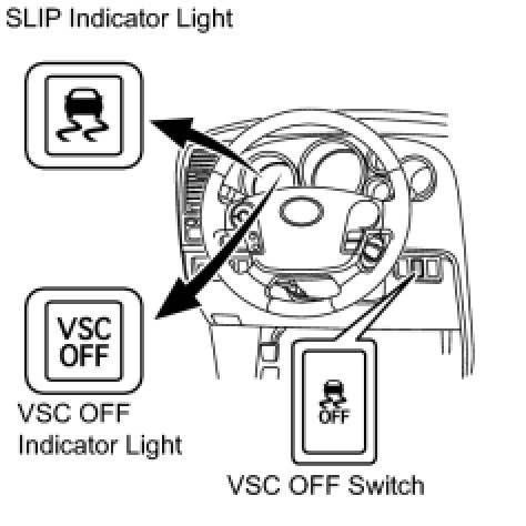 - During VSC OFF mode, the combination meter's SLIP indicator light and VSC OFF indicator light illuminate.