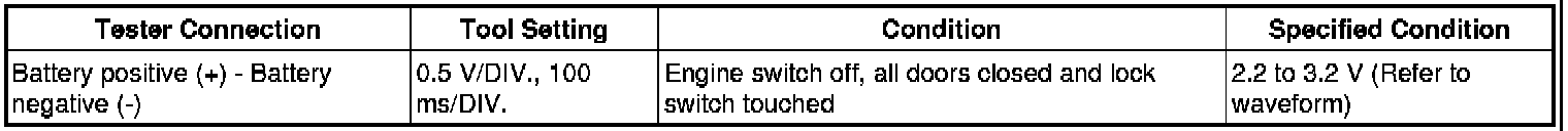 When measuring the battery voltage, bring the electrical key transmitter within the smart key system operating range and operate the lock switch of a door handle to perform the measurement. For the smart key system operating range, refer to System Description Wireless Door Lock Control System (w/ Smart Key System).