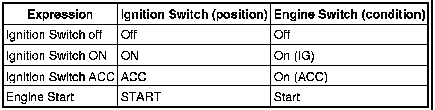 The type of ignition switch used on this model differs according to the specifications of the vehicle. The expressions listed in the table below are used in this section.