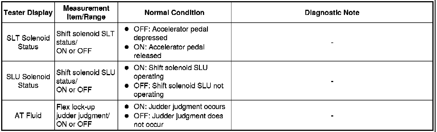 *: Activate the Solenoid (SLT) in the Active Test is performed to check the line pressure changes by connecting SST to the automatic transmission, which is used in the Hydraulic Test Hydraulic Test as well. Note that the pressure values in the Active Test and Hydraulic Test are different.