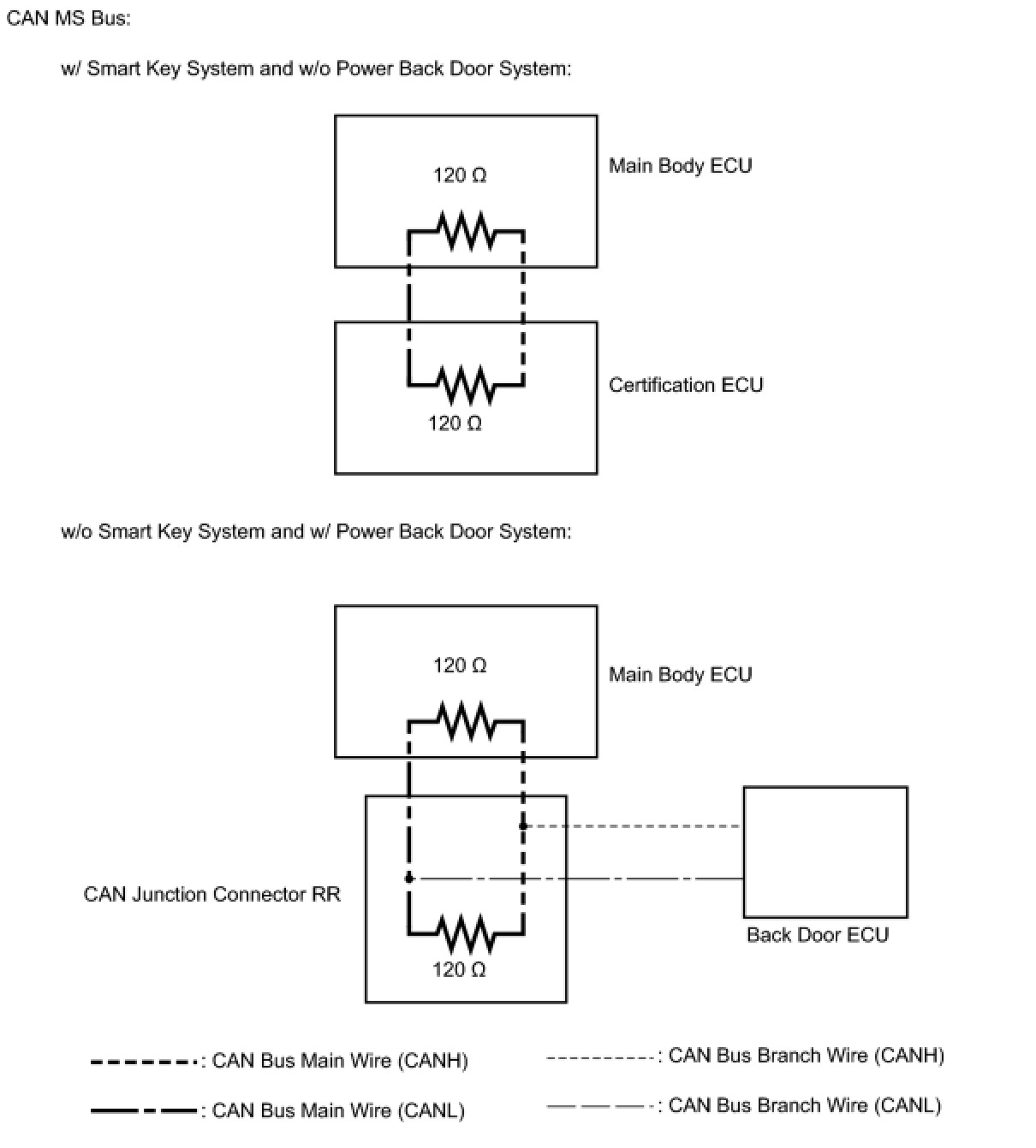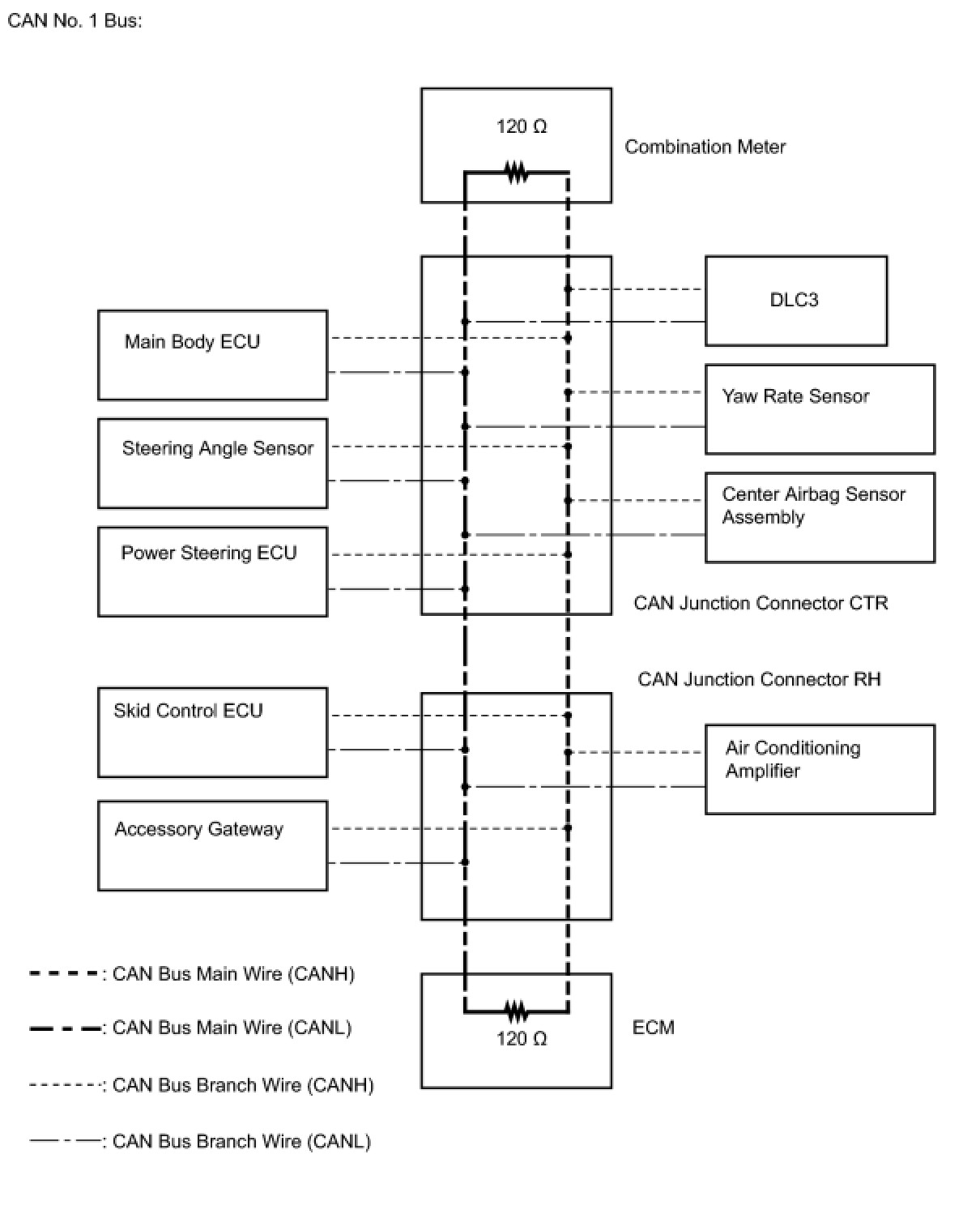(a) Two different types of CAN buses are used. The CAN buses are classified into two types based on typical communication speed. The HS-CAN bus is a high speed communication bus that is used for powertrain, chassis, and some body electrical communication. The HS-CAN bus is referred to as "CAN No. 1 bus". It operates at speeds of approximately 500 kbps. Terminating resistors for the CAN No. 1 bus are located in the combination meter and ECM. The resistance of the CAN No. 2 bus cannot be measured from the DLC3 connector. The MS-CAN bus is a medium speed communication bus that is used for body electrical communication. The MS-CAN bus is referred to as "MS bus" and it operates at speeds of approximately 250 kbps. Terminating resistors for the MS-CAN bus are located in the main body ECU and the certification ECU (or the CAN junction connector RR). The resistance of the MS-CAN bus cannot be measured from the DLC3 connector. Communication between these networks is handled via the main body ECU (for the CAN MS bus), which acts as a gateway.