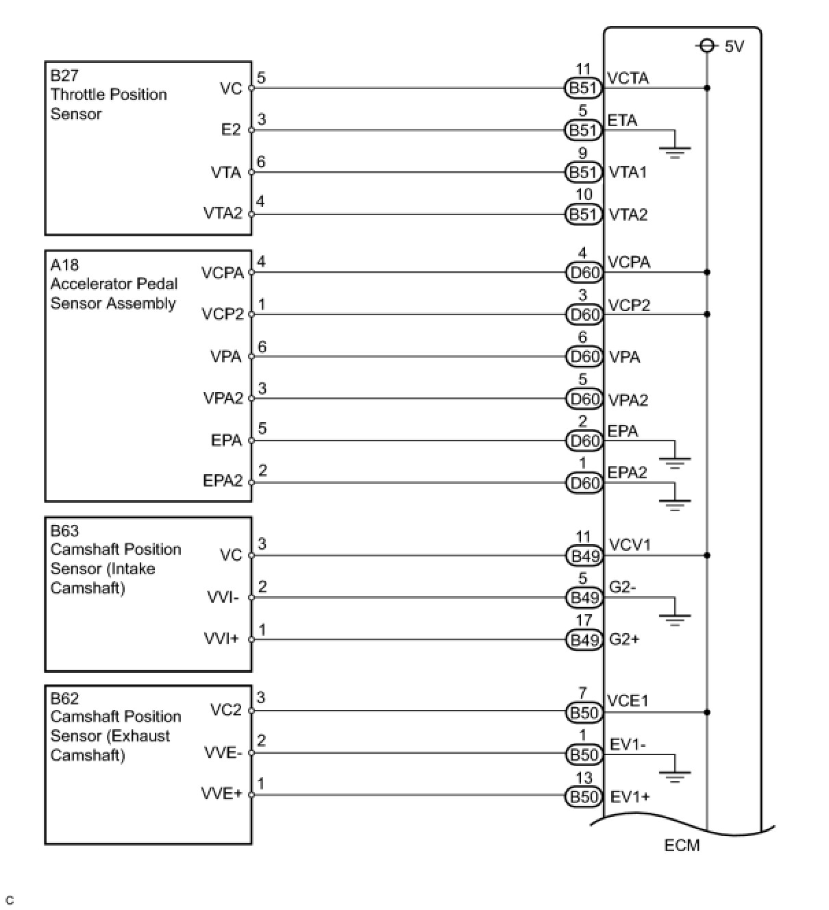 The ECM constantly generates 5 V of power from battery voltage supplied to the +B (BATT) terminal to operate the microprocessor. The ECM also provides this power to the sensors through the VC output circuit.