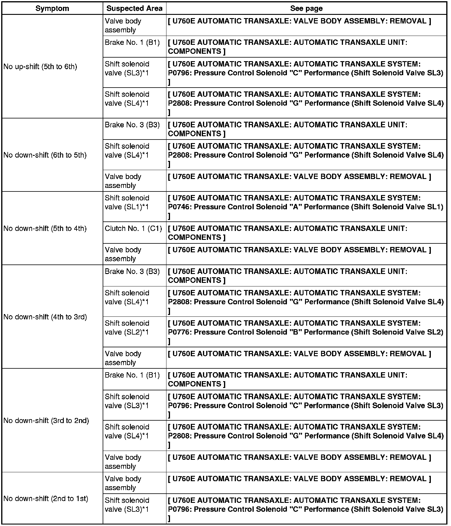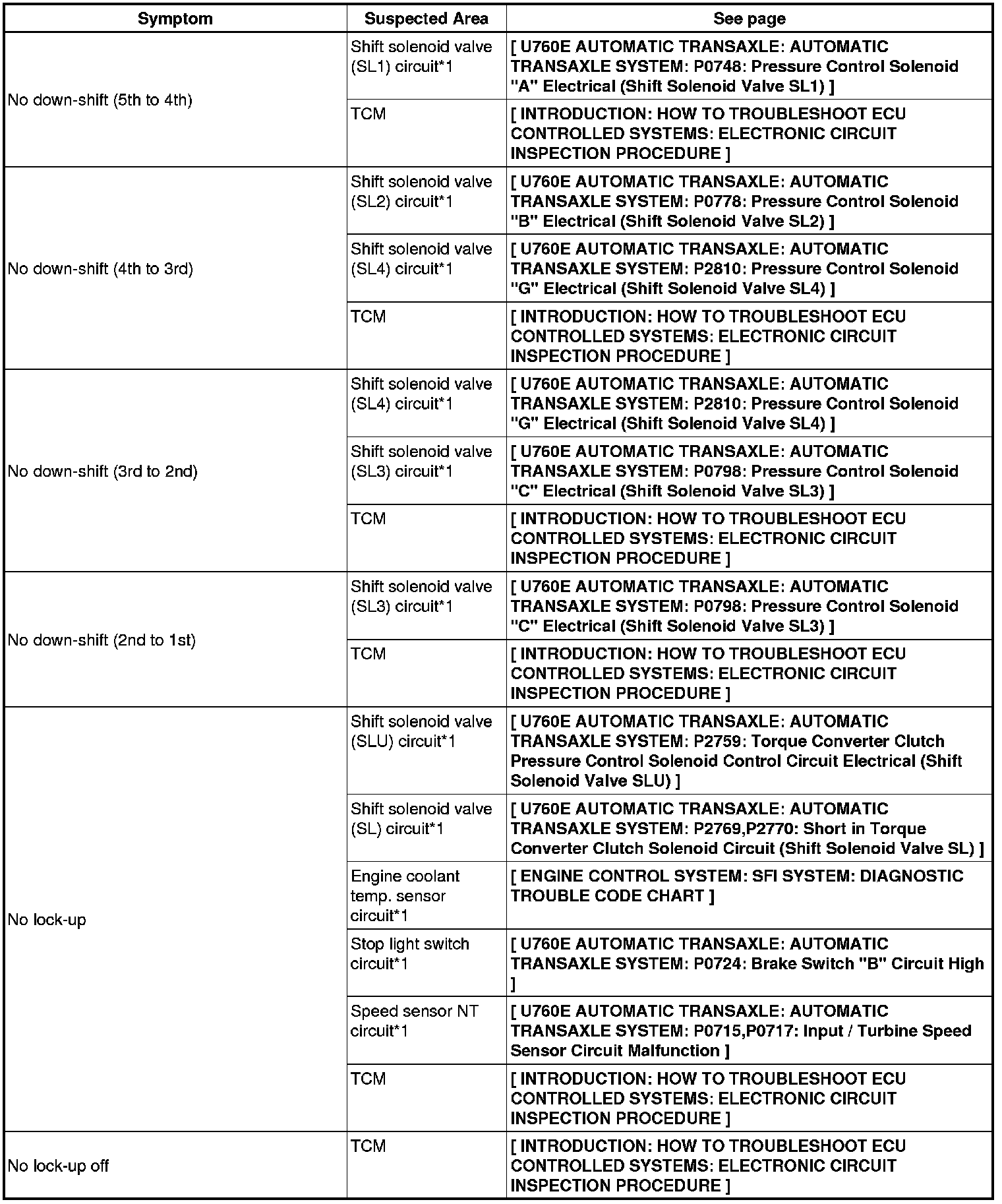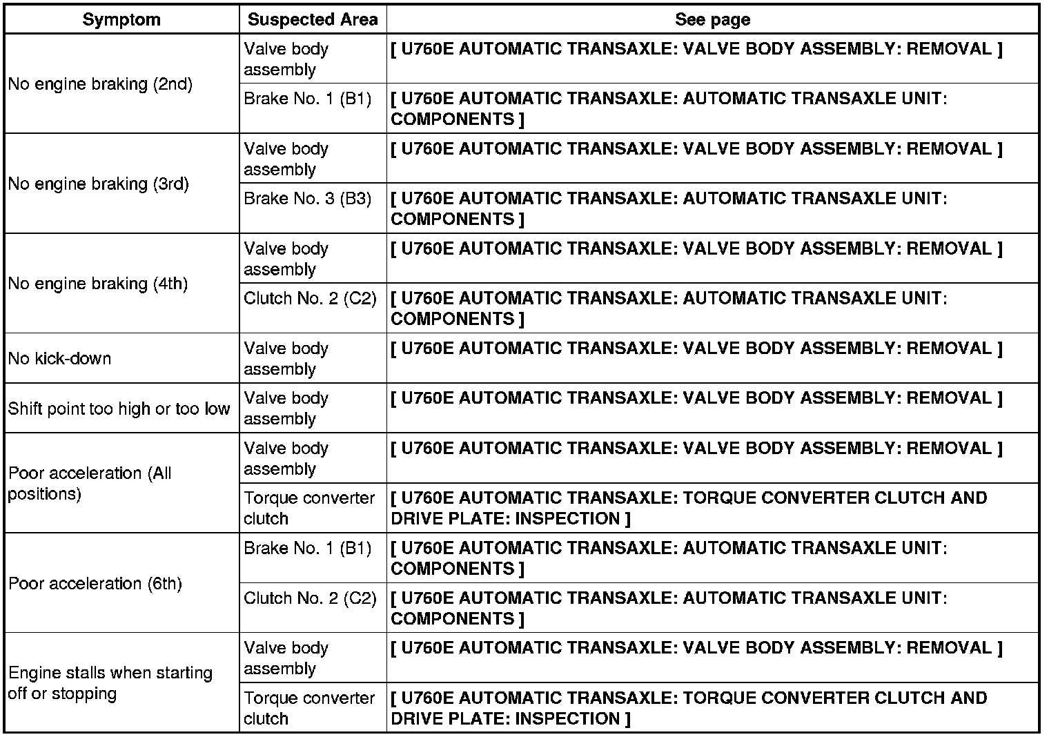 U760E AUTOMATIC TRANSAXLE: AUTOMATIC TRANSAXLE SYSTEM: PROBLEM SYMPTOMS TABLE