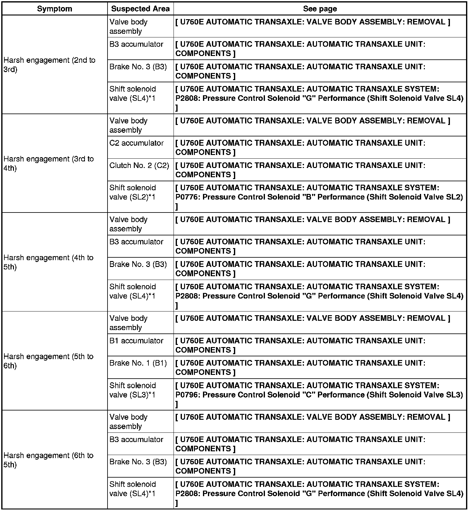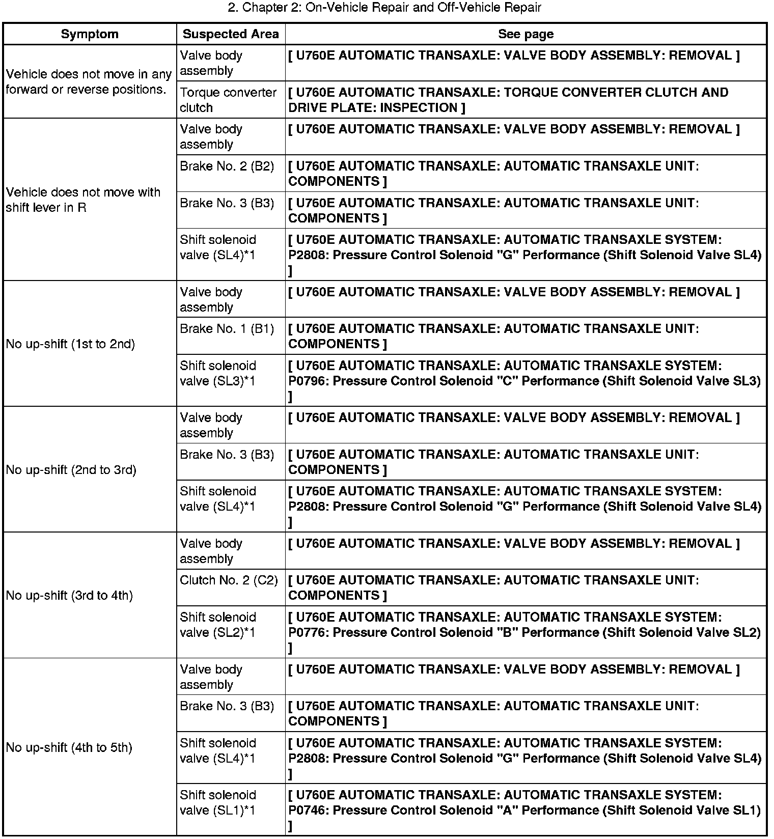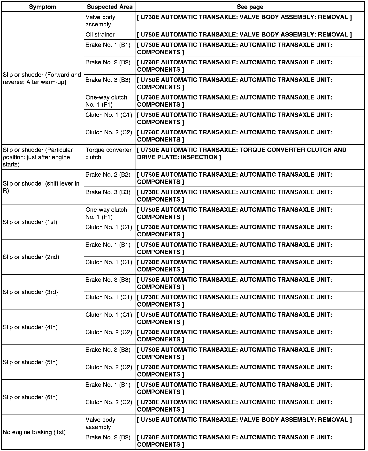 U760E AUTOMATIC TRANSAXLE: AUTOMATIC TRANSAXLE SYSTEM: PROBLEM SYMPTOMS TABLE