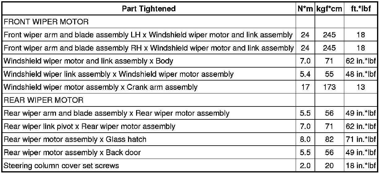SERVICE SPECIFICATIONS: WIPER AND WASHER: TORQUE SPECIFICATIONS