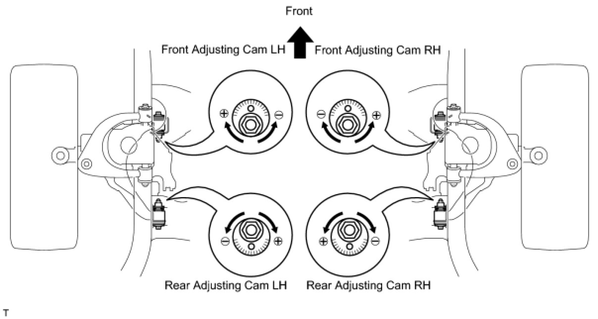 (b) Turn the toe adjusting cam and camber adjusting cam in both directions, and adjust the camber and caster to the center value.