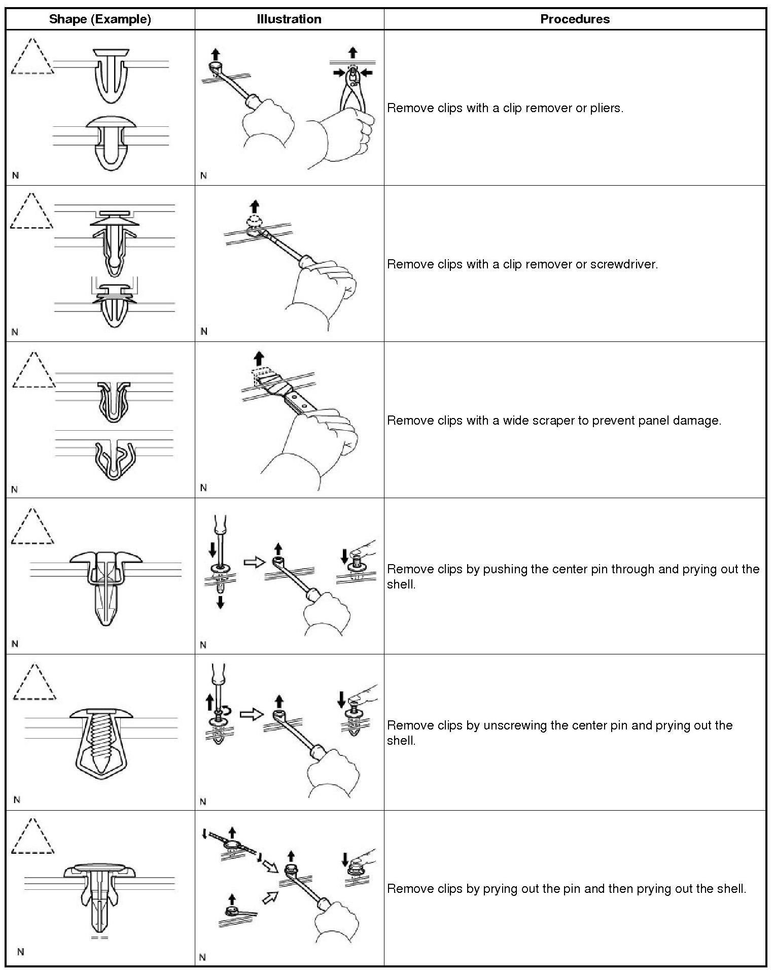 (1) The removal and installation methods of typical clips used for vehicle body parts are shown in the table below.
