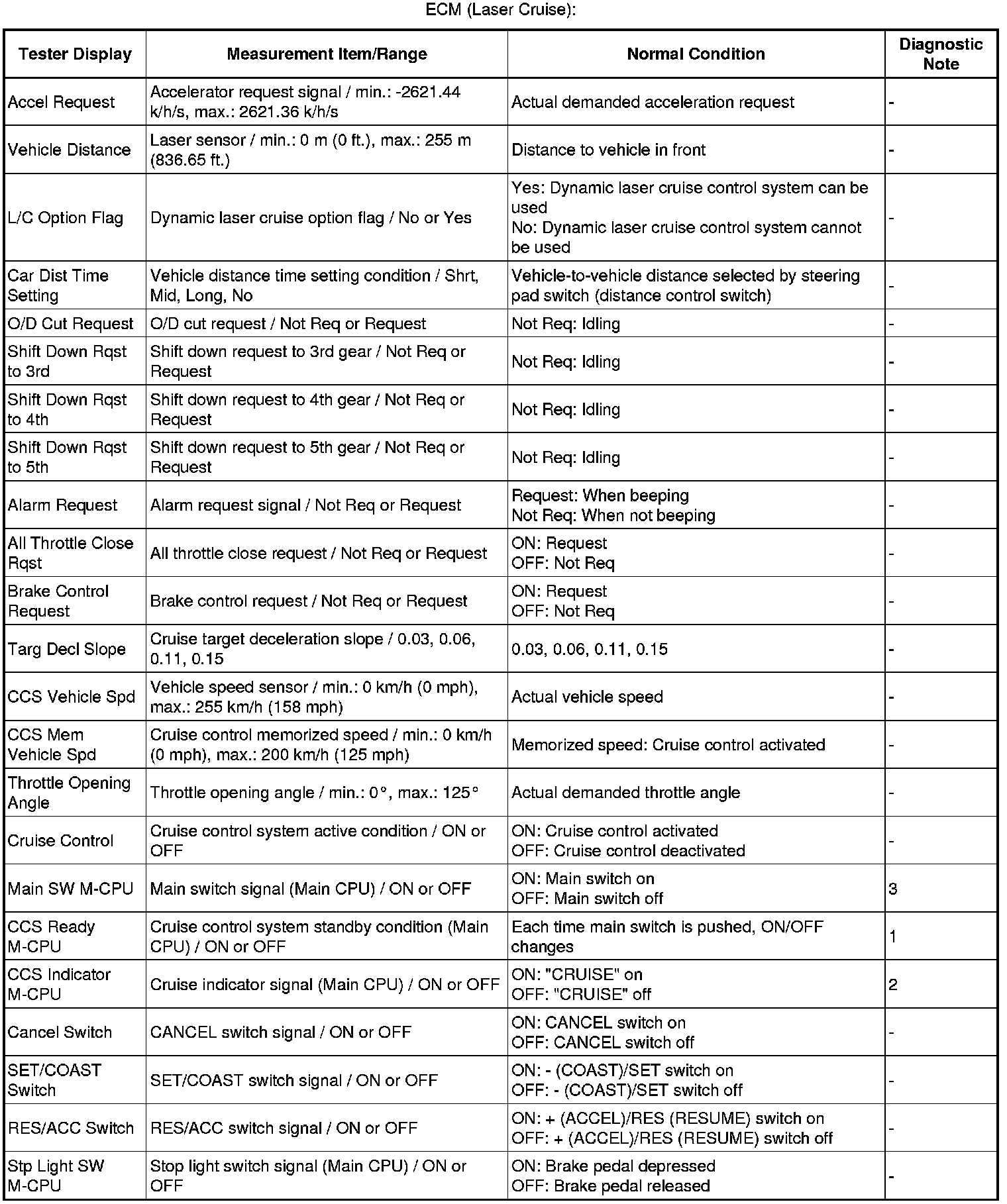 * 3 is OK, but cruise indicator does not turn on -> Indicator, wire harness, or ECM failure