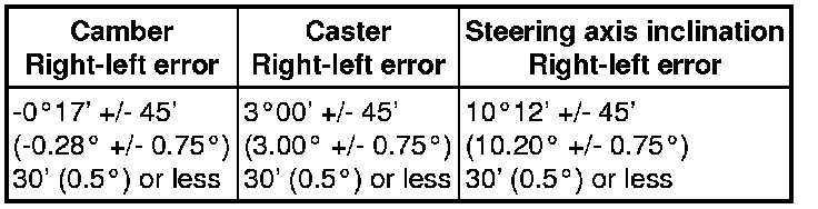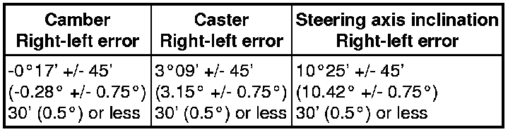 If the caster and steering axis inclination are not within the specified values, after the camber has been correctly adjusted, recheck the suspension parts for damaged and worn out parts.