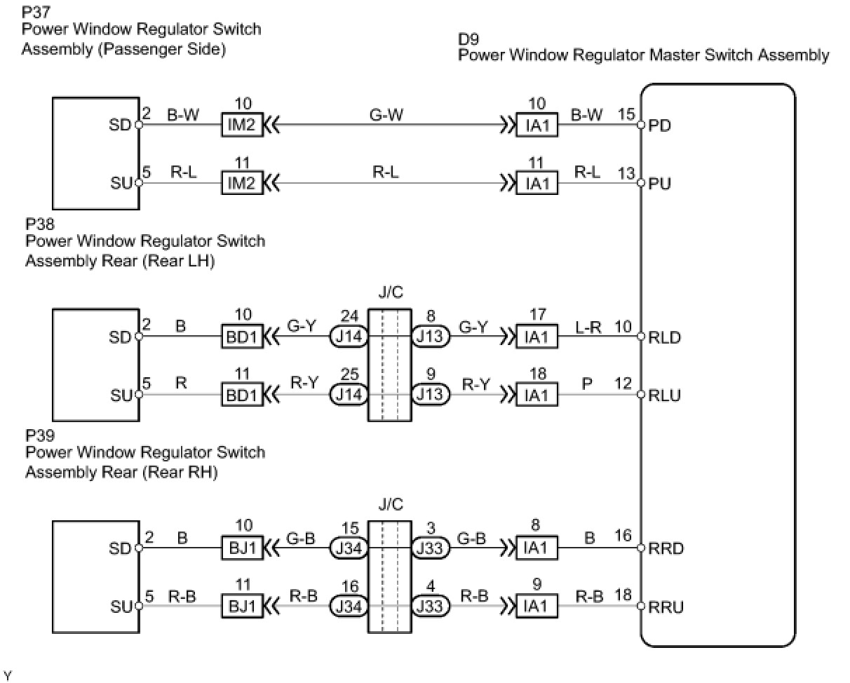 * There is an open or short circuit in the wiring between the power window master switch and the applicable power window regulator switch.