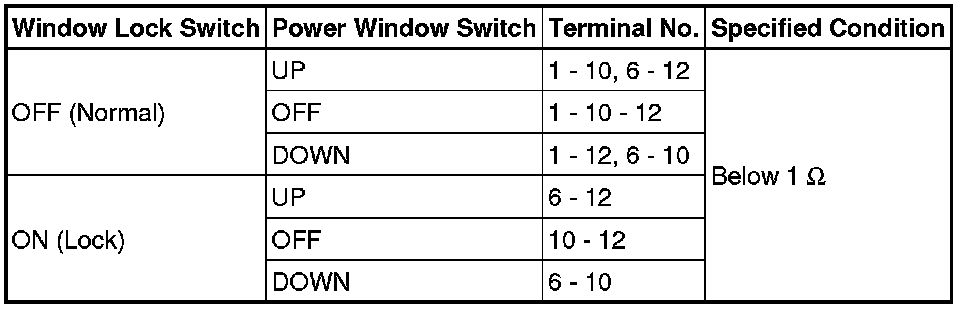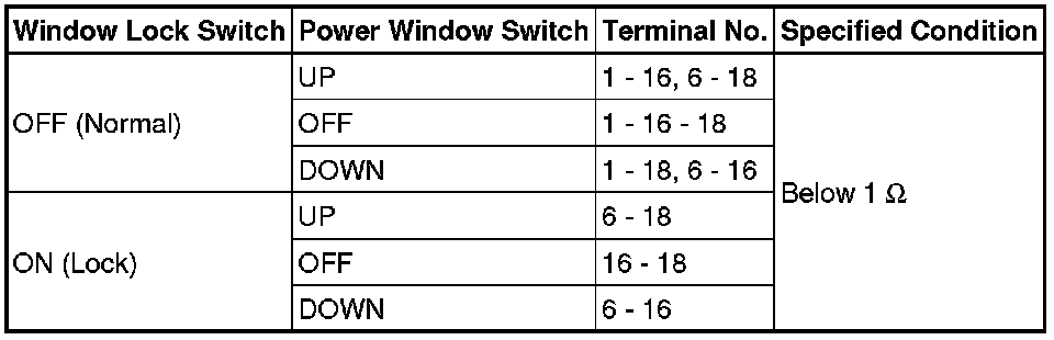 (b) Check the resistance between the terminals of the master switch when each switch is operated, as shown in the table below.