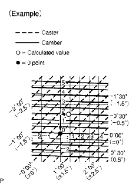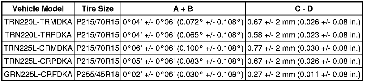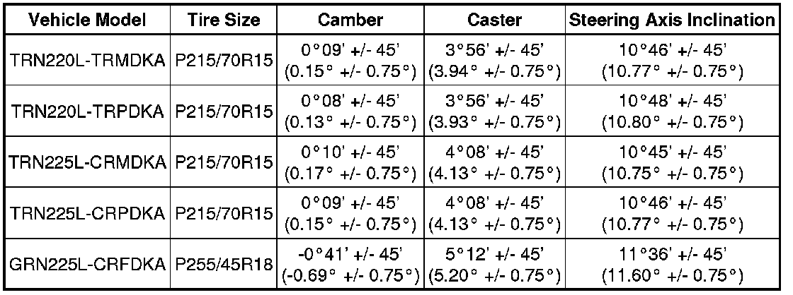 * The tolerance for the difference between the left and right wheels is 30' (0.50°) or less for both the camber and caster.