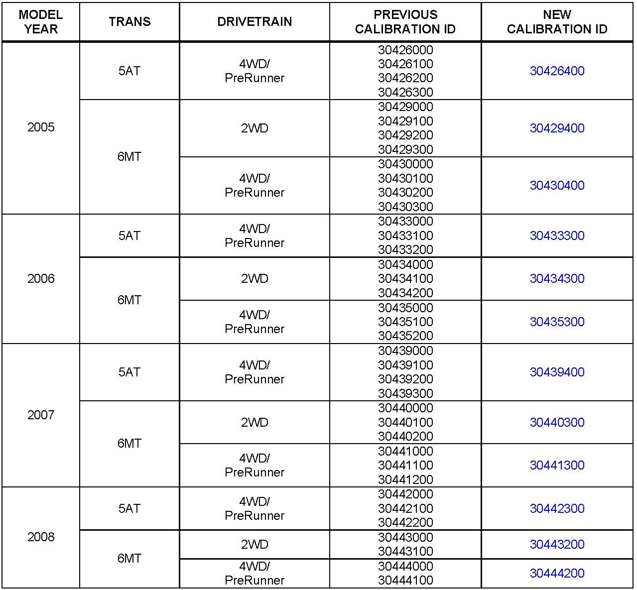 ^ Calibration ID(s) [Refer to the Calibration Information chart for the NEW CALIBRATION ID]