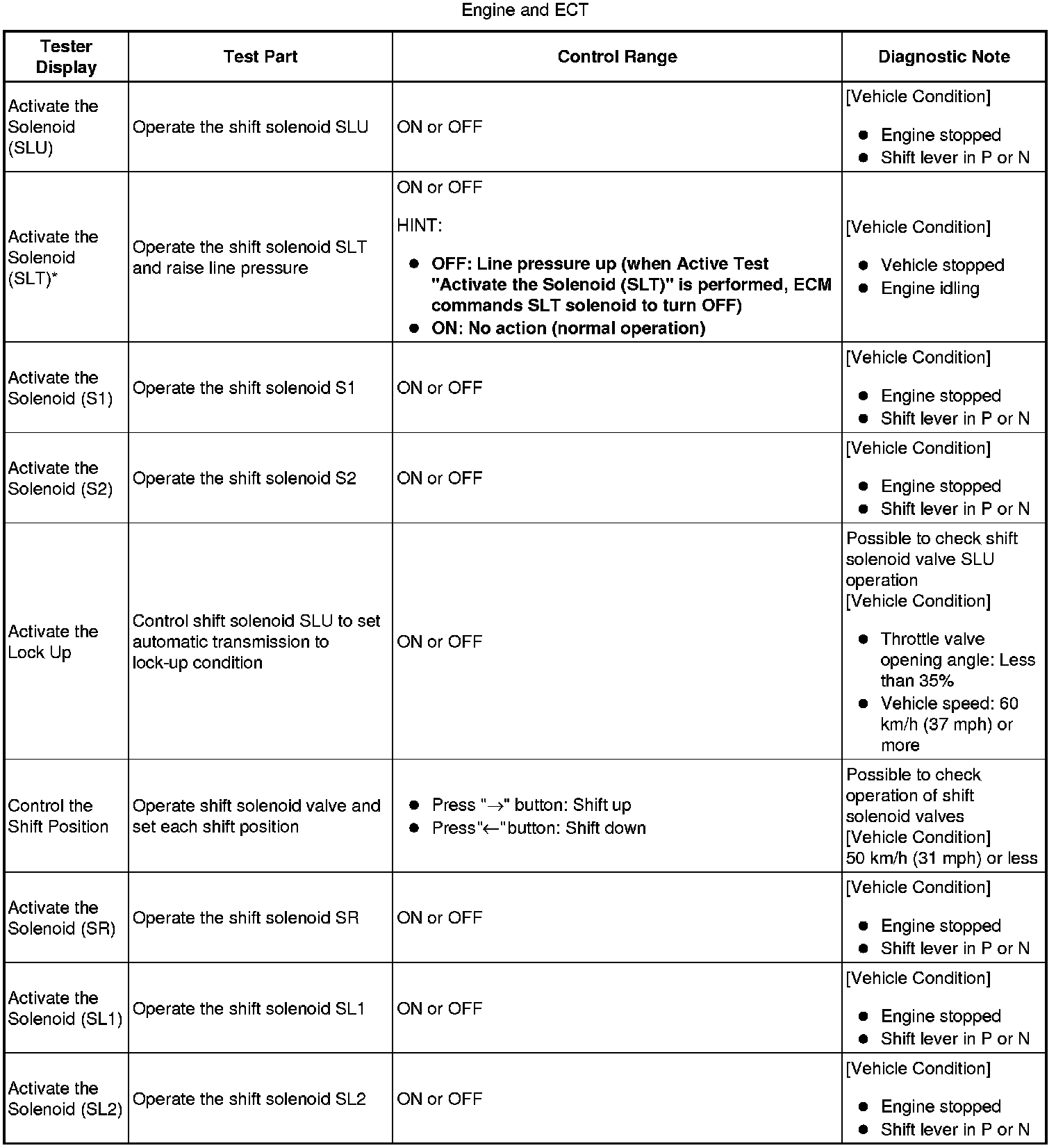 * *: Activate the Solenoid (SLT) in the Active Test is performed to check the line pressure changes by connecting SST to the automatic transmission, which is used in the Hydraulic Test Hydraulic Test as well.