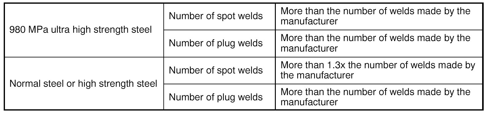 1. Follow the welding conditions below when welding ultra high strength steel to assure sufficient weld strength.