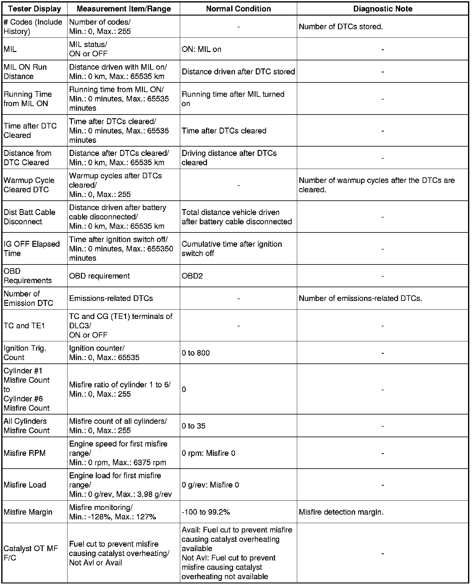 Using the Techstream to read the Data List allows the values or states of switches, sensors, actuators and other items to be read without removing any parts. This non-intrusive inspection can be very useful because intermittent conditions or signals may be discovered before parts or wiring is disturbed. Reading the Data List information early in troubleshooting is one way to save diagnostic time.