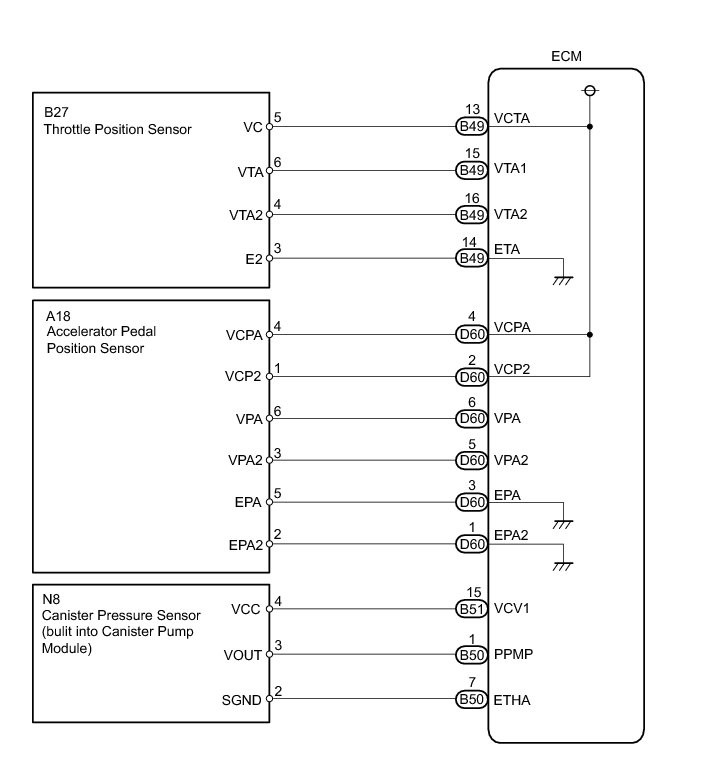 The ECM constantly uses 5 V from the battery voltages supplied to the +B (BATT) terminal to operate the microprocessor. The ECM also provides this power to the sensors through the VC output circuit.