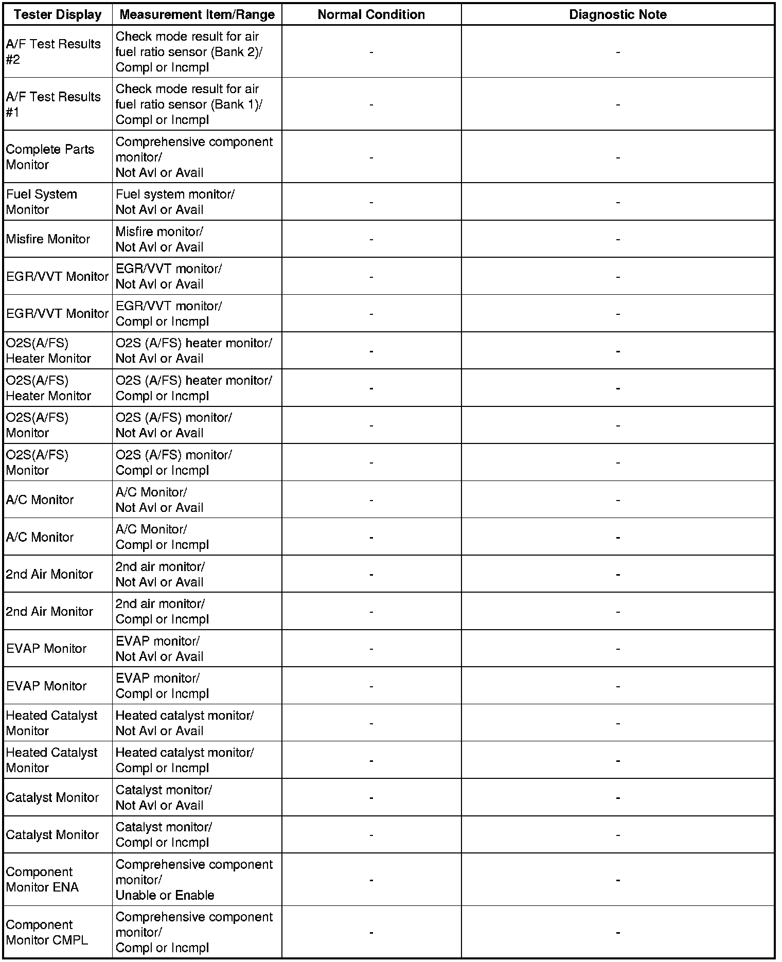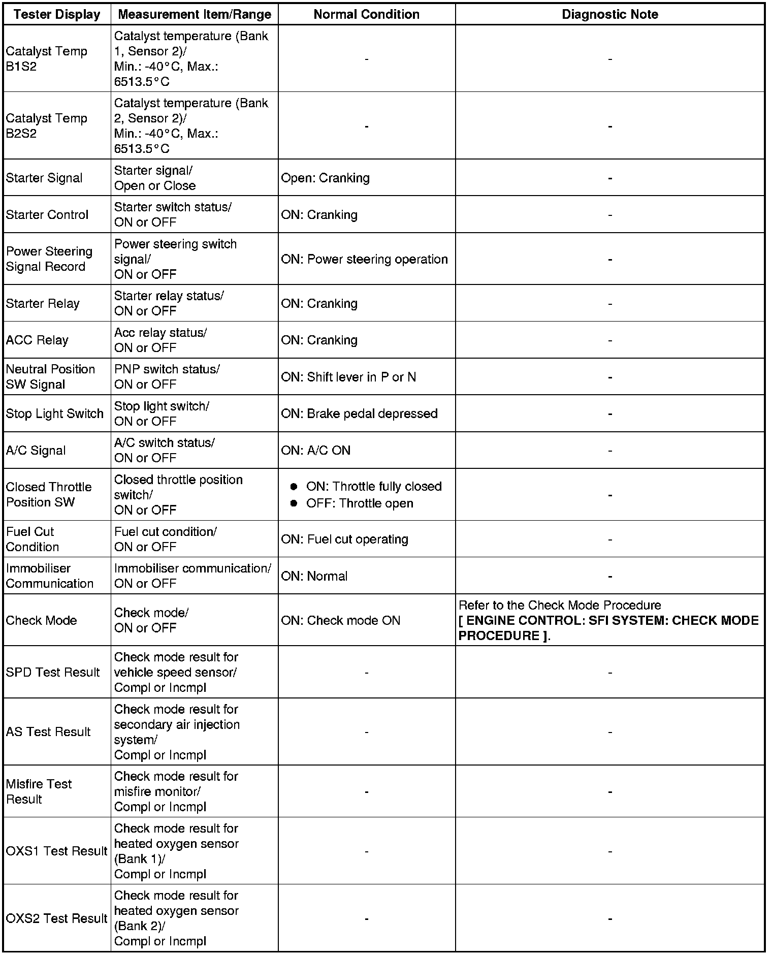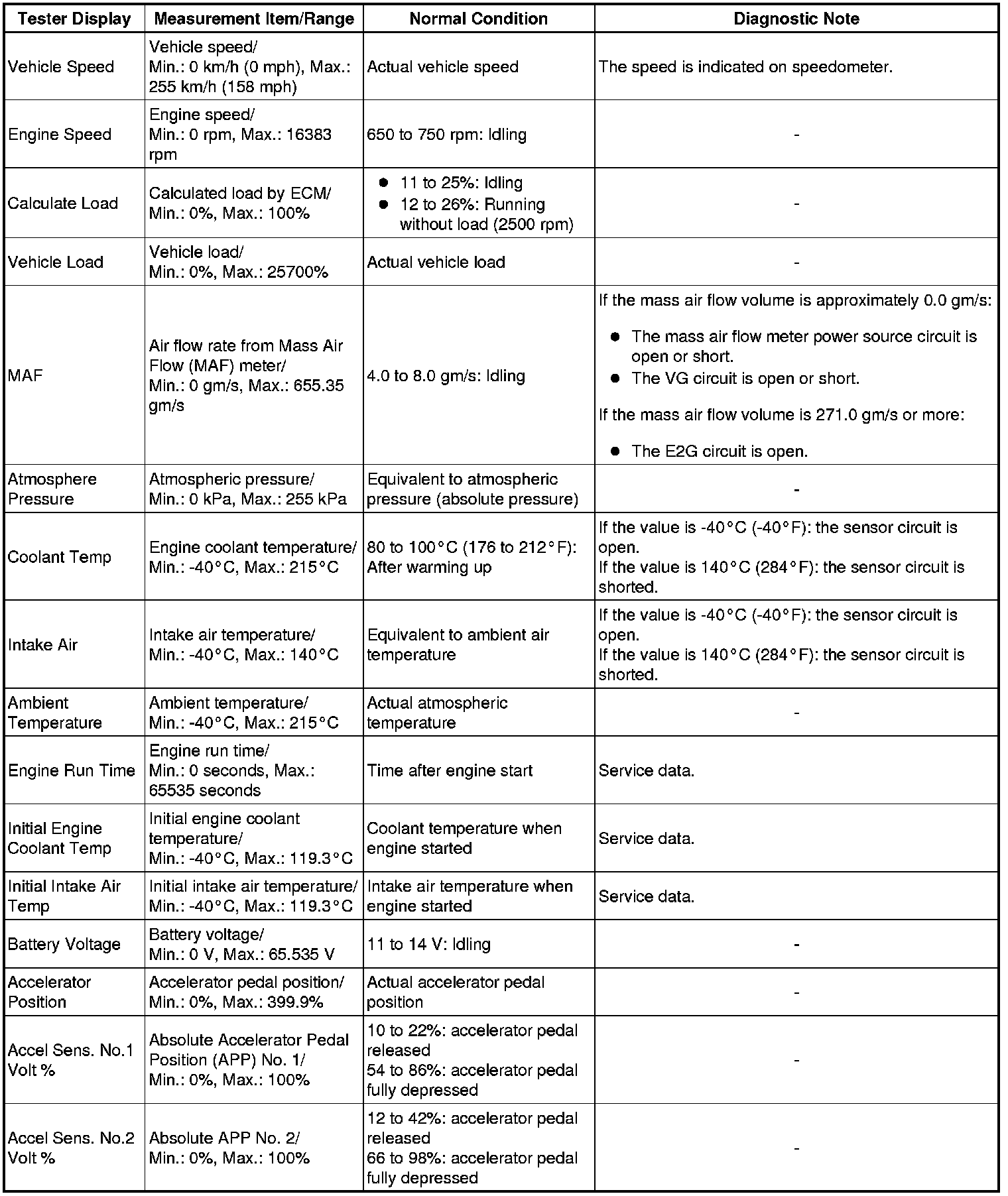 * Normal Condition: If no conditions are specifically stated for "idling", the shift lever is in N or P, the A/C switch is off and all accessory switches are off.