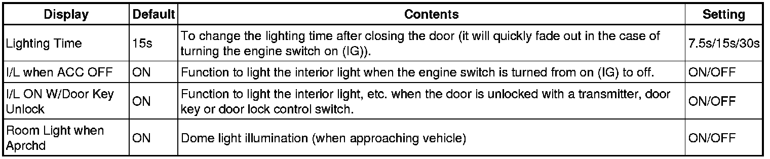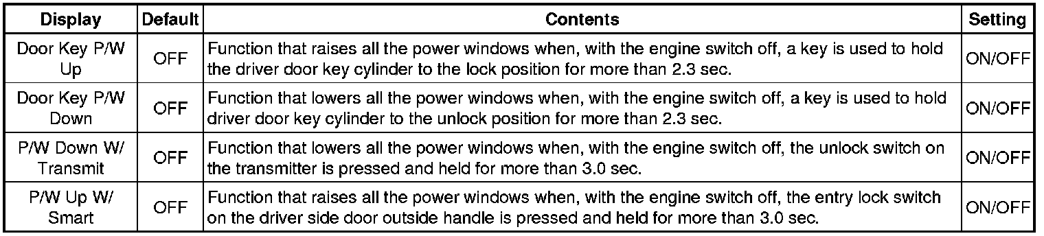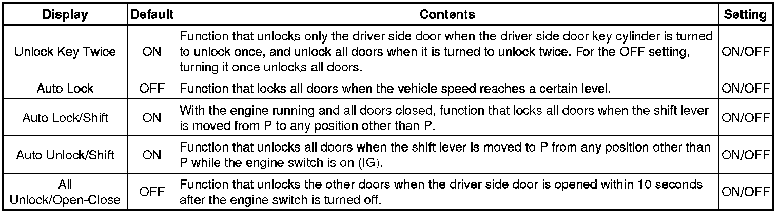 * When the switches are pressed and held for 5 seconds, the entry door unlock mode changes in the following order: driver door unlock mode, all door unlock mode.