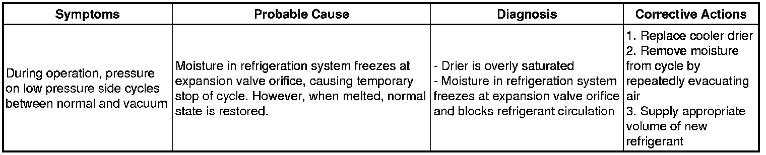 (1) The A/C system periodically changes between normal and improper function due to moisture in the refrigerant system.