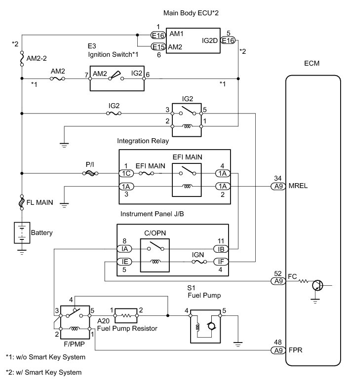 The F/PMP relay switches the fuel pump speed according to the engine conditions. The fuel pump operates when the ECM receives the starter-operating signal (STA) and crankshaft-rotating signal (NE). The F/PMP relay is turned ON while the engine is idling or operating at low load. This causes current to flow through the fuel pump resistor to the fuel pump. The fuel pump then operates at low speed. The F/PMP relay is turned OFF while the engine is cranking or operating at high load. The fuel pump then operates at normal speed.