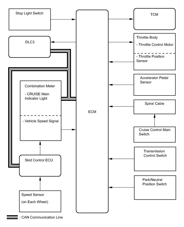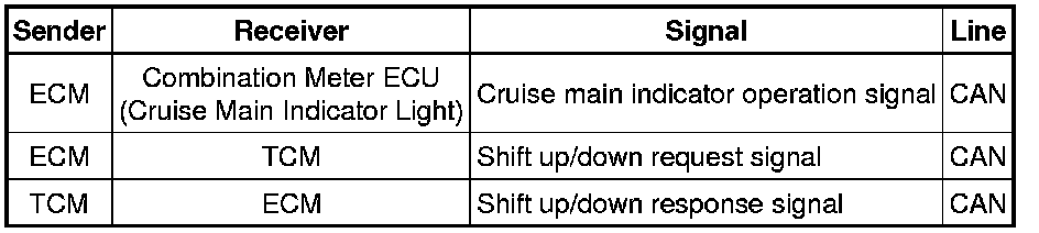 The ECM receives signals such as ON-OFF, - SET, + RES, and CANCEL from the cruise control main switch and executes the command.