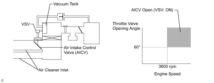 When the engine is operating in the low-to-mid speed range, this control operates the air intake control valve to close one of the air cleaner inlets. When the engine speed is more than 3600 rpm and the opening angle of the throttle valve is more than 60°, the ECM activates the VSV and opens the air intake control valve.