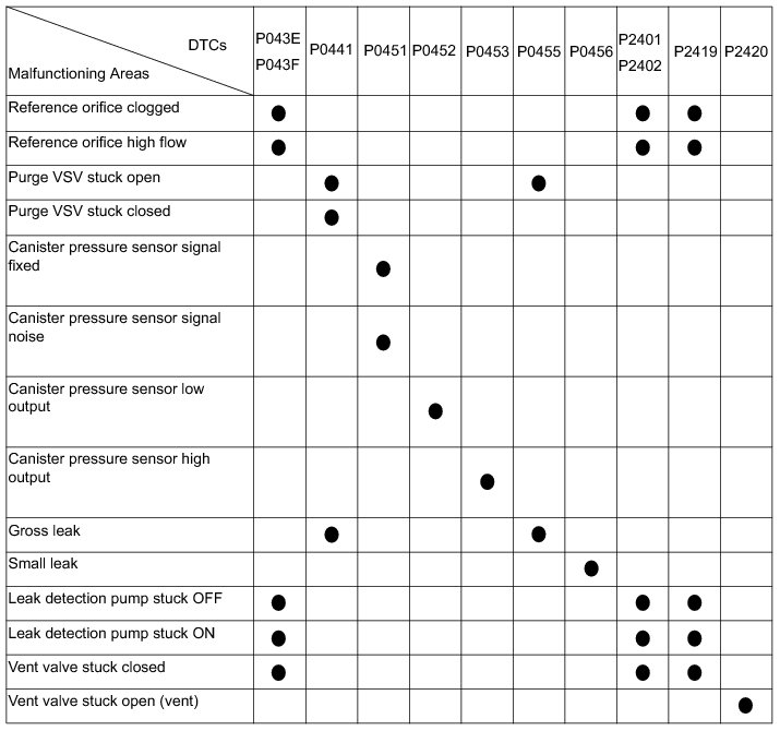 If any EVAP system DTCs are set, the malfunctioning area can be determined using the table below.
