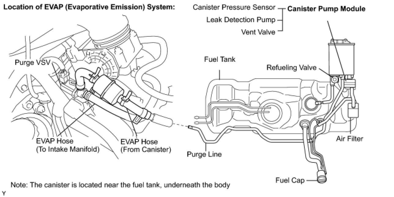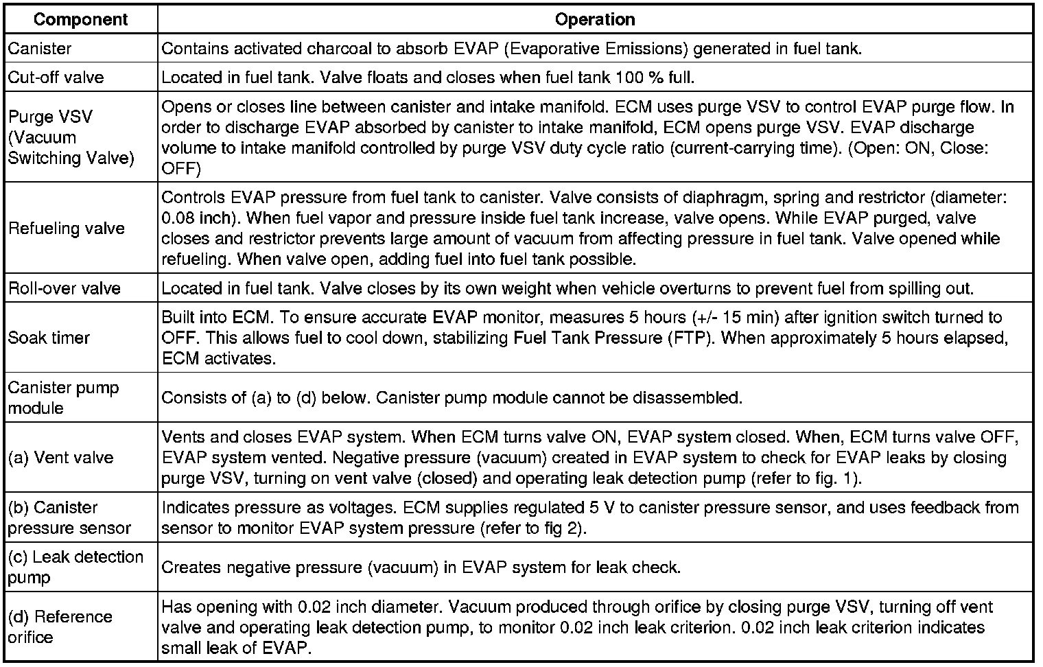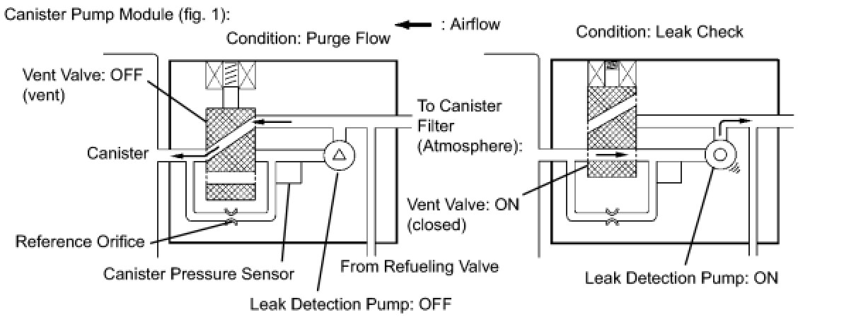 The leak detection pump creates negative pressure (vacuum) in the EVAP system and the pressure is measured. Finally, the ECM monitors for leaks from the EVAP system, and malfunctions in both the canister pump module and purge VSV, based on the EVAP pressure.