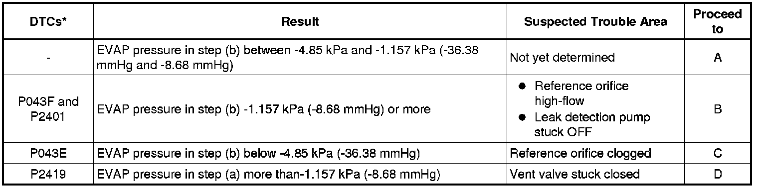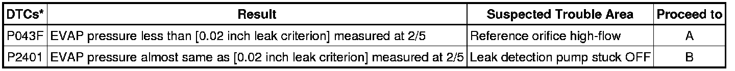 If the 0.02 inch leak criterion difference between the first and second checks is greater than the specification, the DTCs corresponding to the leak criterion (P043E, P043F, P2401, P2402 and P2419) will all be stored.