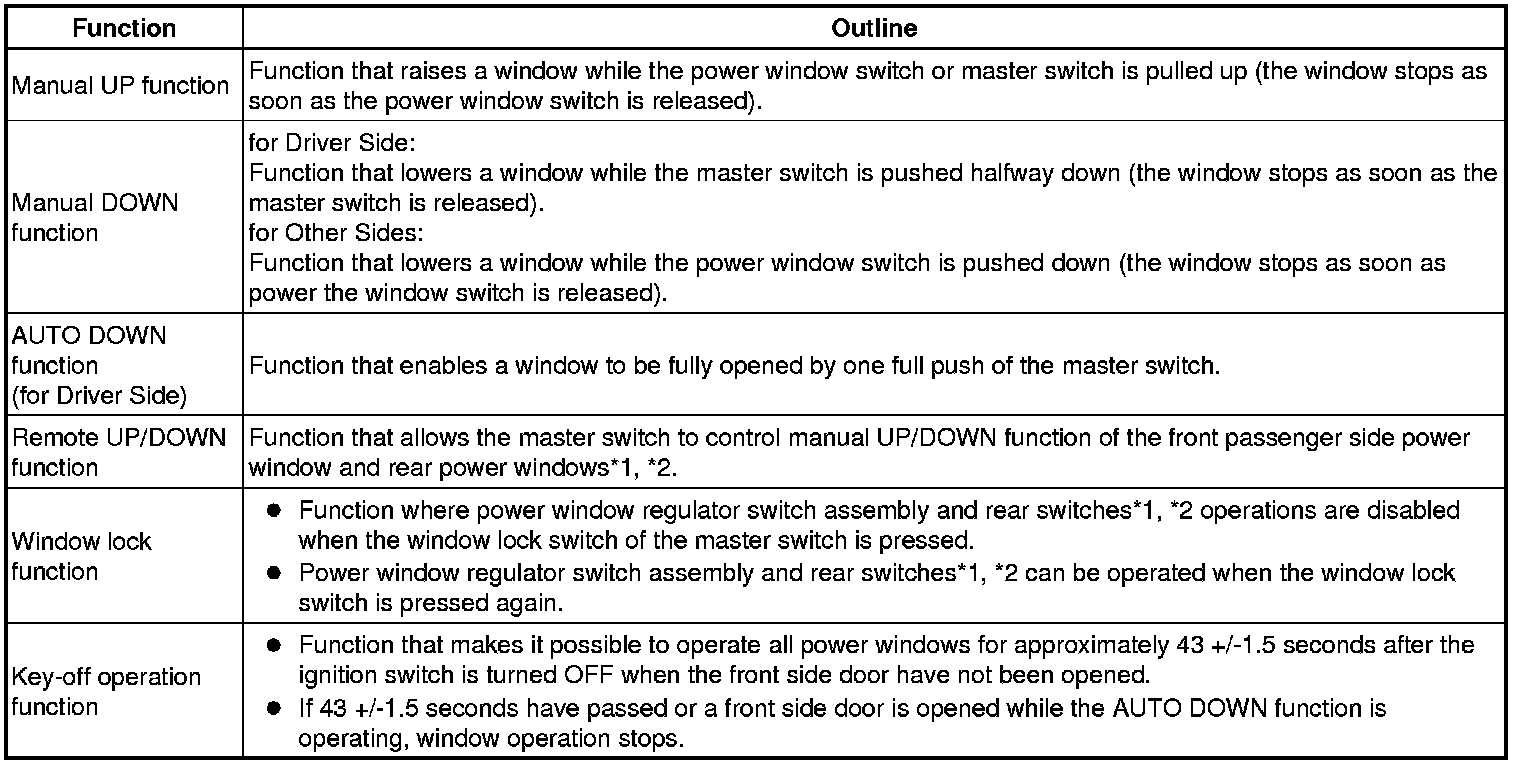 The main controls of this system are the master switch, which is built into the driver side door, and the power window regulator switches, which are built into the front passenger side door and rear doors*1, *2.