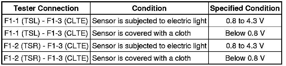 * The connection procedure for using a digital tester such as a TOYOTA electrical tester is shown above. When using an analog tester, connect the positive (+) lead to terminal 2 and negative (-) lead to terminal 1 of the solar sensor.