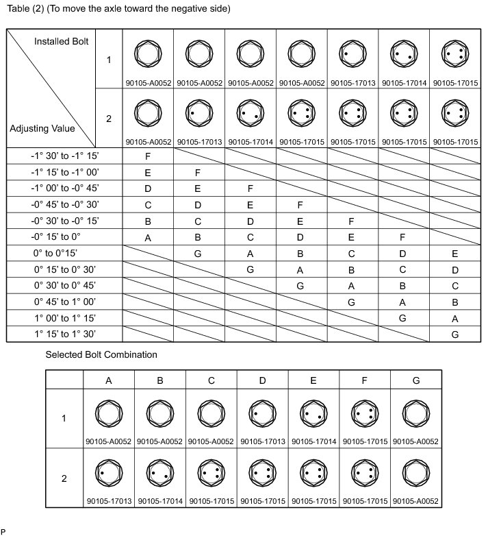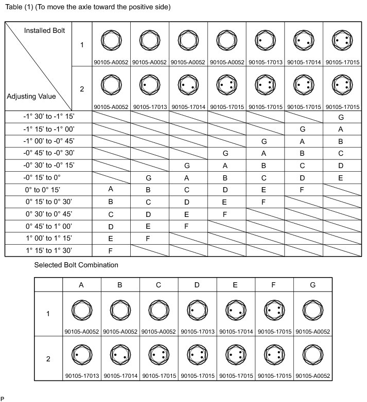 Check the combination of installed bolts. Select appropriate bolts from the table below to adjust the camber to the specified values.