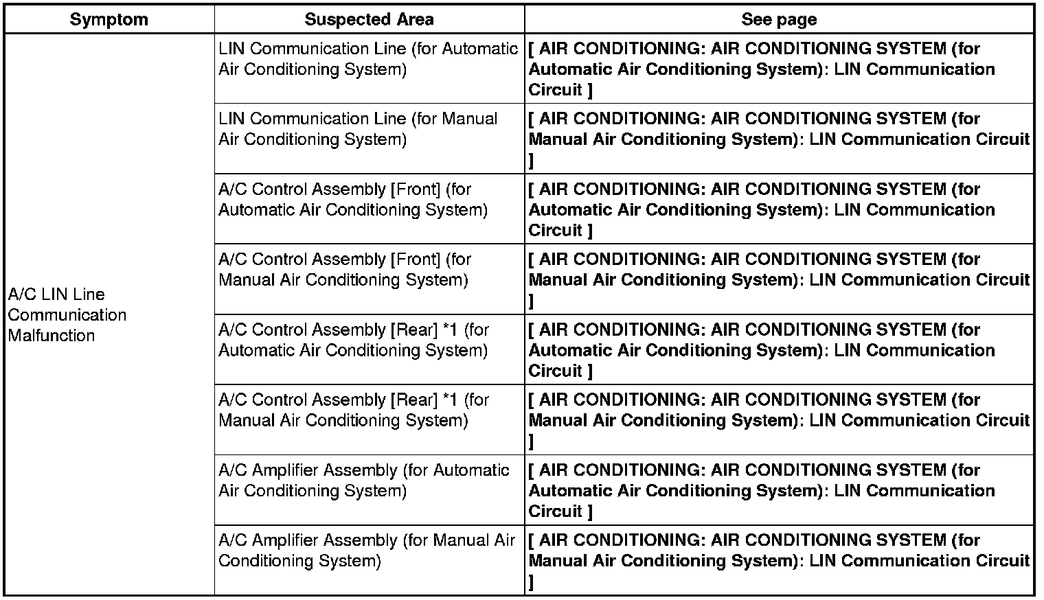 MULTIPLEX COMMUNICATION: LIN COMMUNICATION SYSTEM: PROBLEM SYMPTOMS TABLE