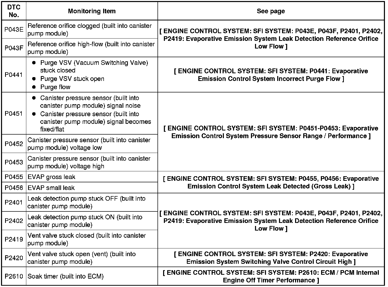 If the reference pressure difference between the first and second checks is more than the specification, all the DTCs relating to the reference pressure (P043E, P043F, P0441, P0455, P0456, P2401, P2420) will all be stored.