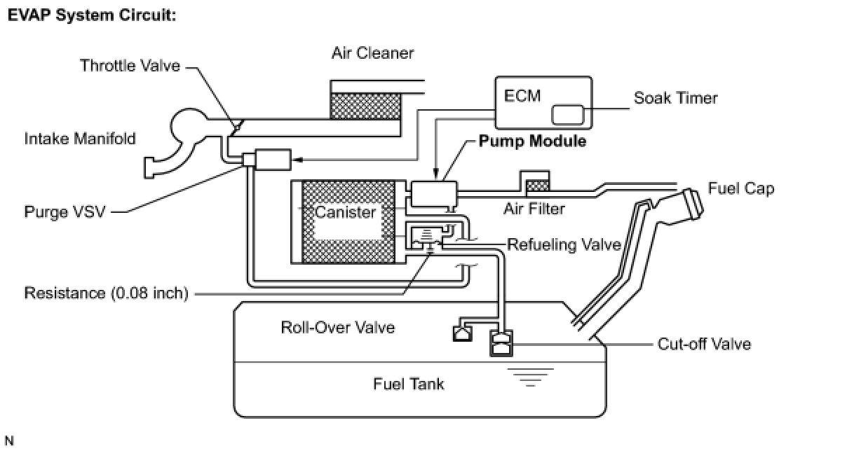 The leak detection pump creates negative pressure (vacuum) in the EVAP system and the pressure is measured. Finally, the ECM monitors for leaks from the EVAP system, and malfunctions in both the canister pump module and purge VSV based on the EVAP pressure.