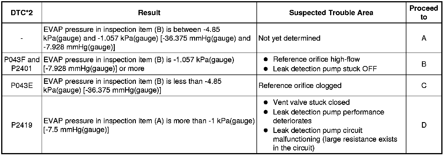 * *2: This result suggests that due to purge line blockage or purge VSV malfunction, the DTC was stored by the purge flow monitor while the engine was running, or that key-off monitor test result were nearly borderline values.