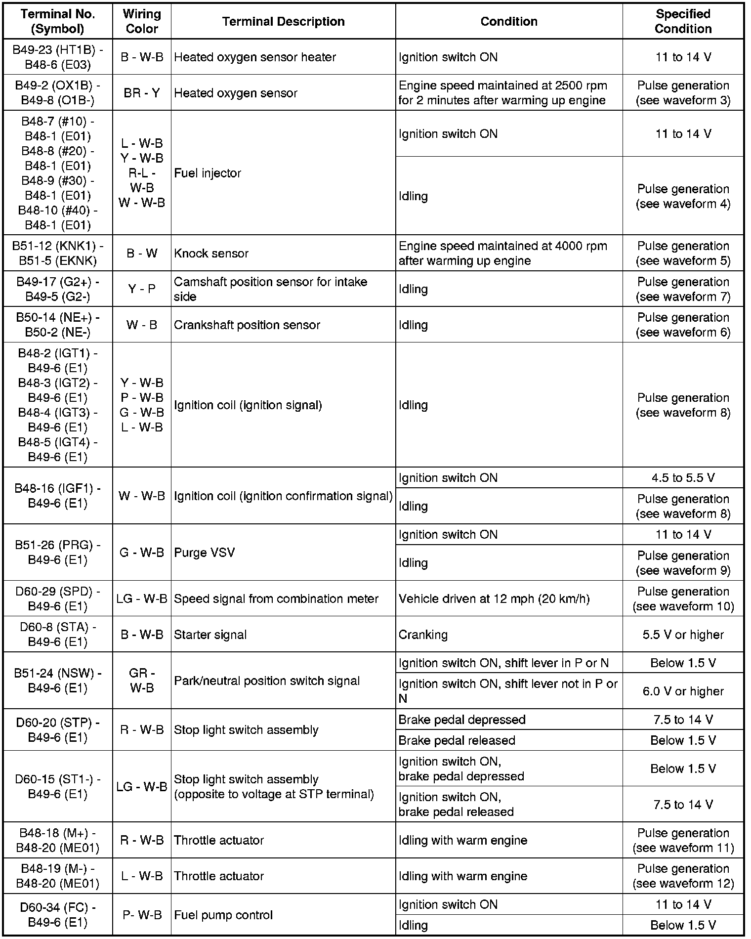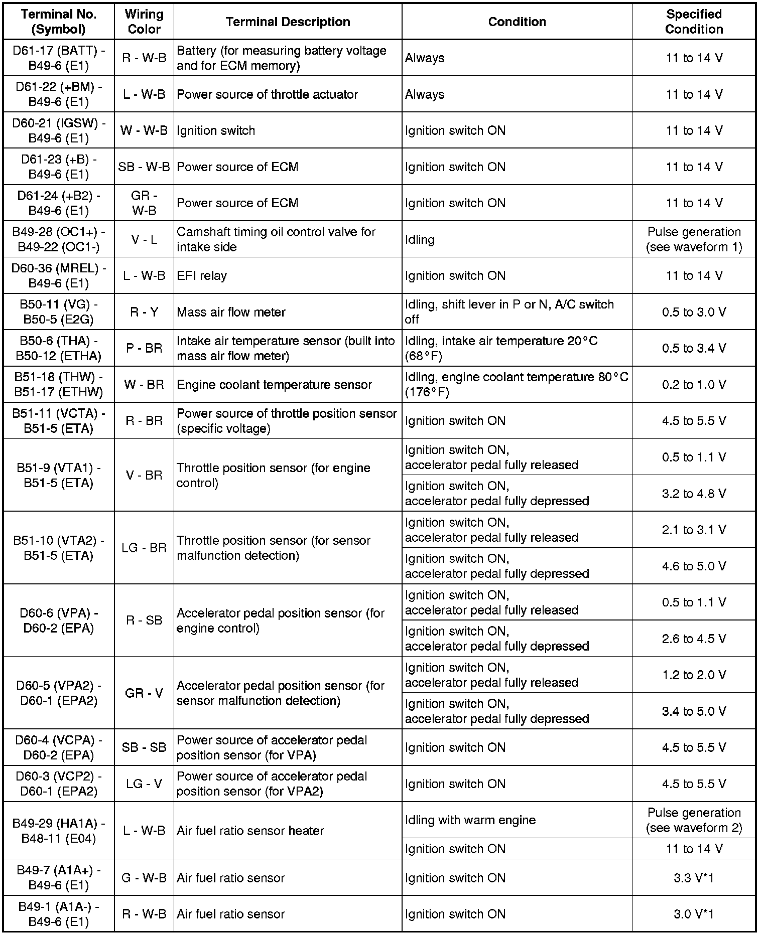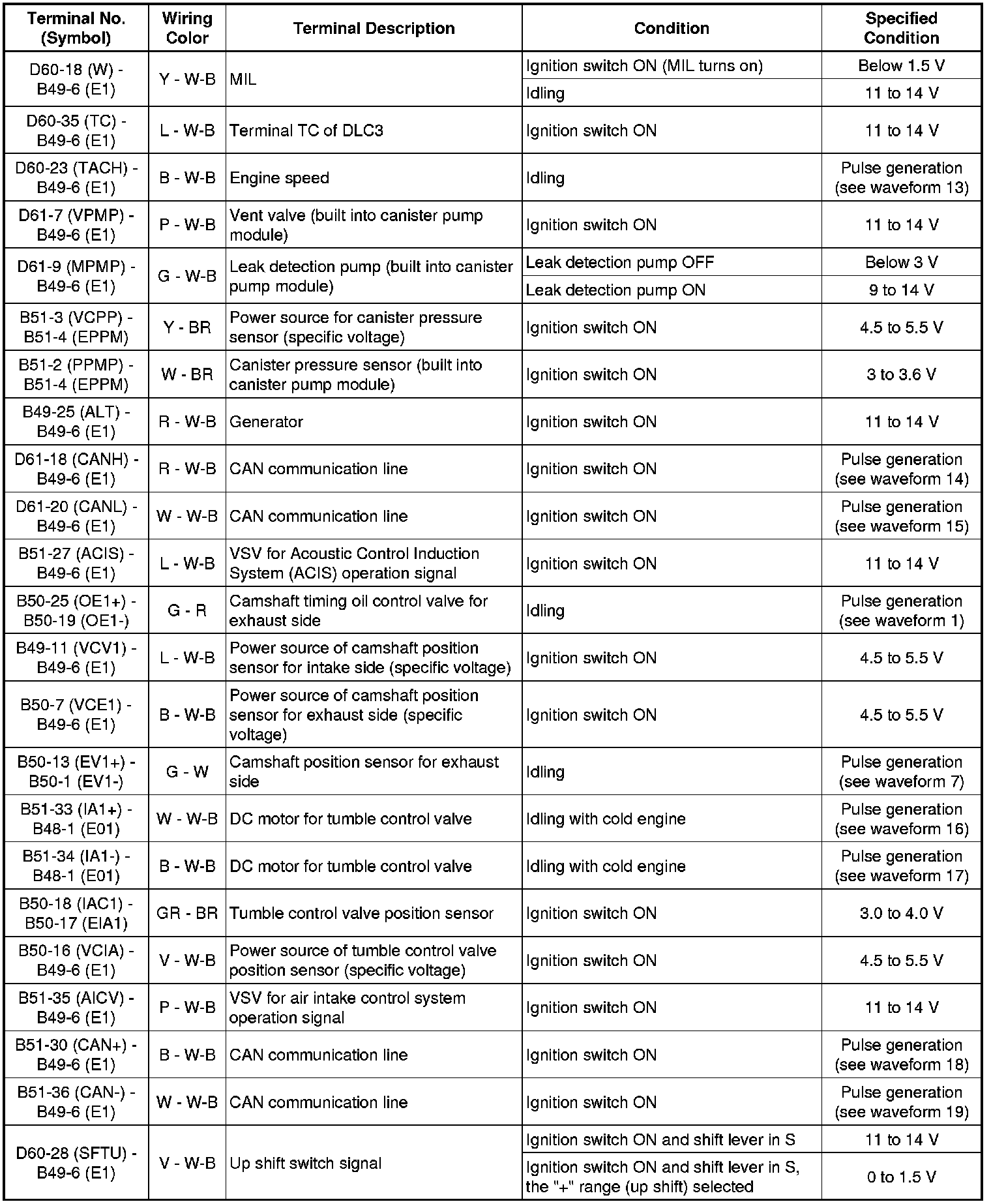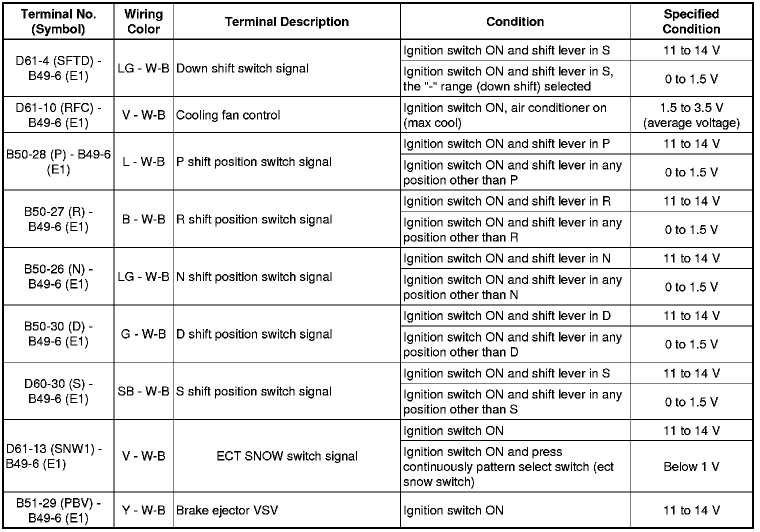The standard voltage between each pair of ECM terminals is shown in the table below. The appropriate conditions for checking each pair of terminals are also indicated. The result of checks should be compared with the standard voltage for that pair of terminals, displayed in the Specified Condition column. The illustration above can be used as a reference to identify the ECM terminal locations.