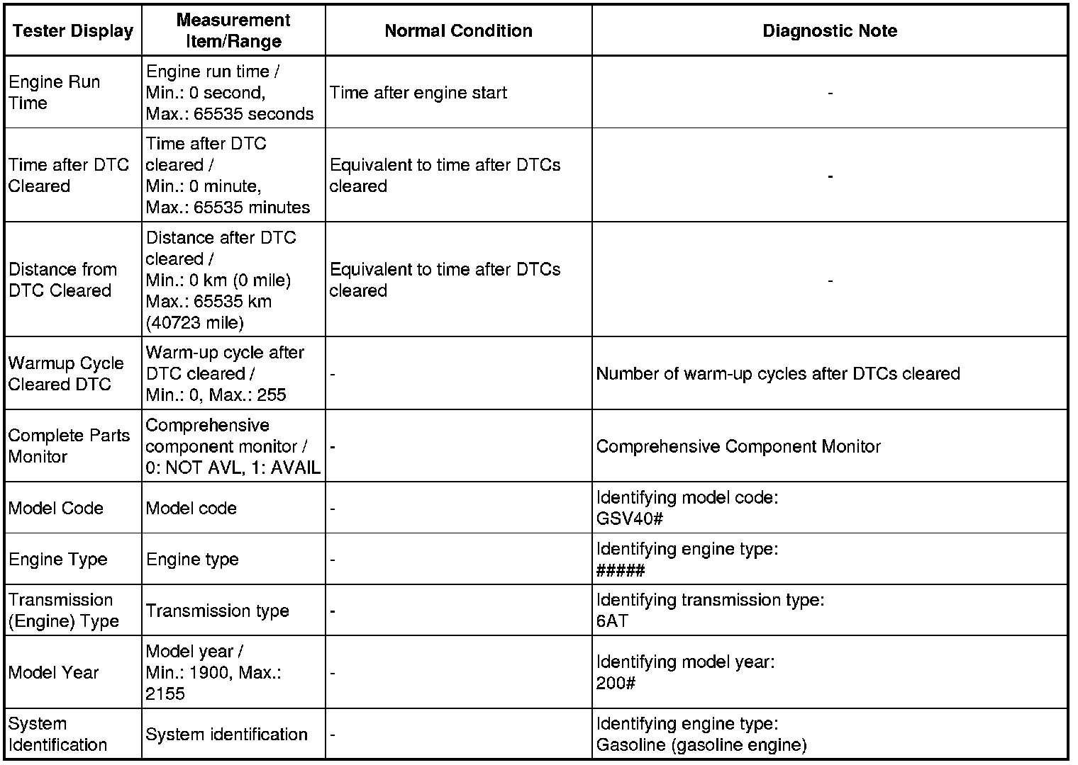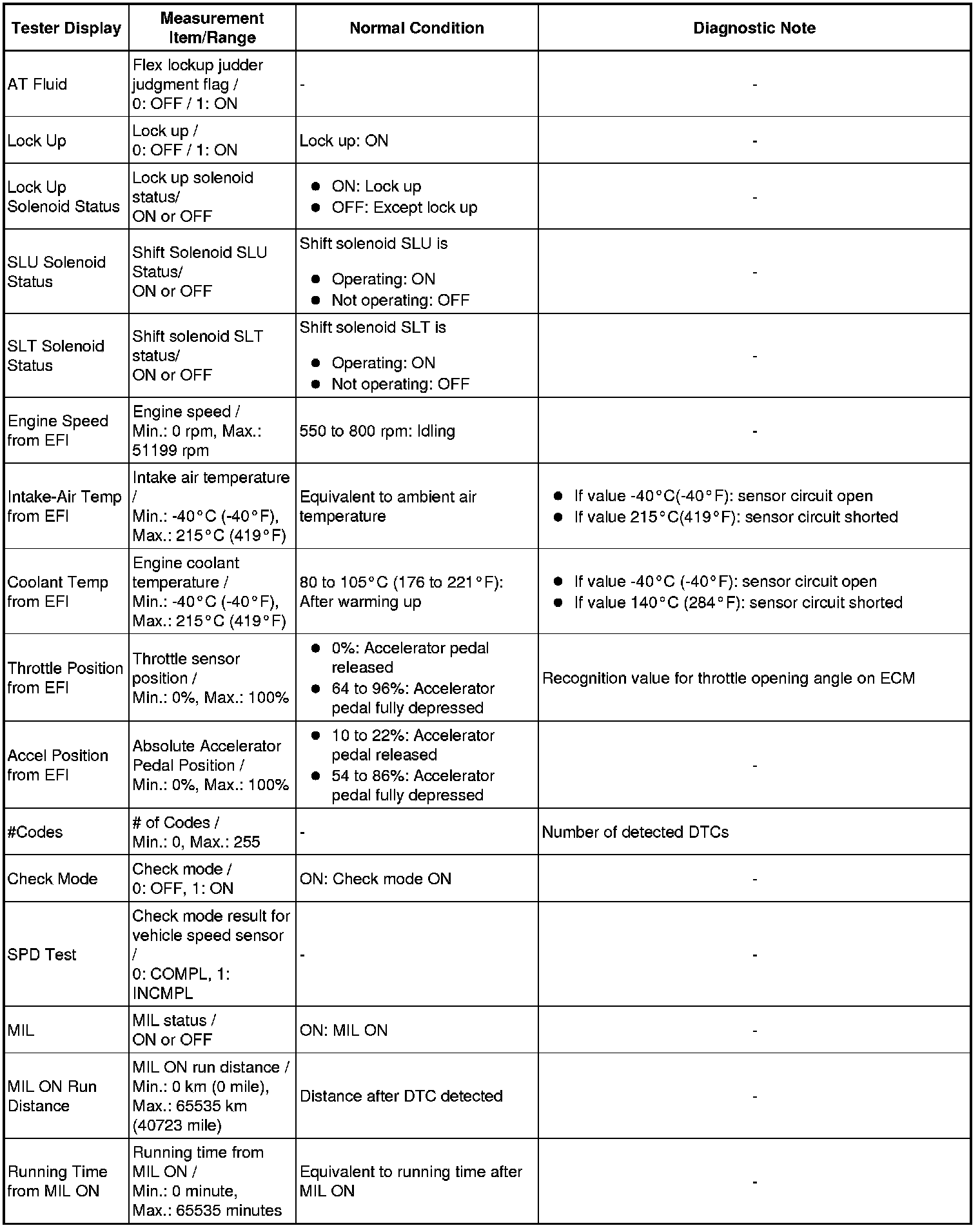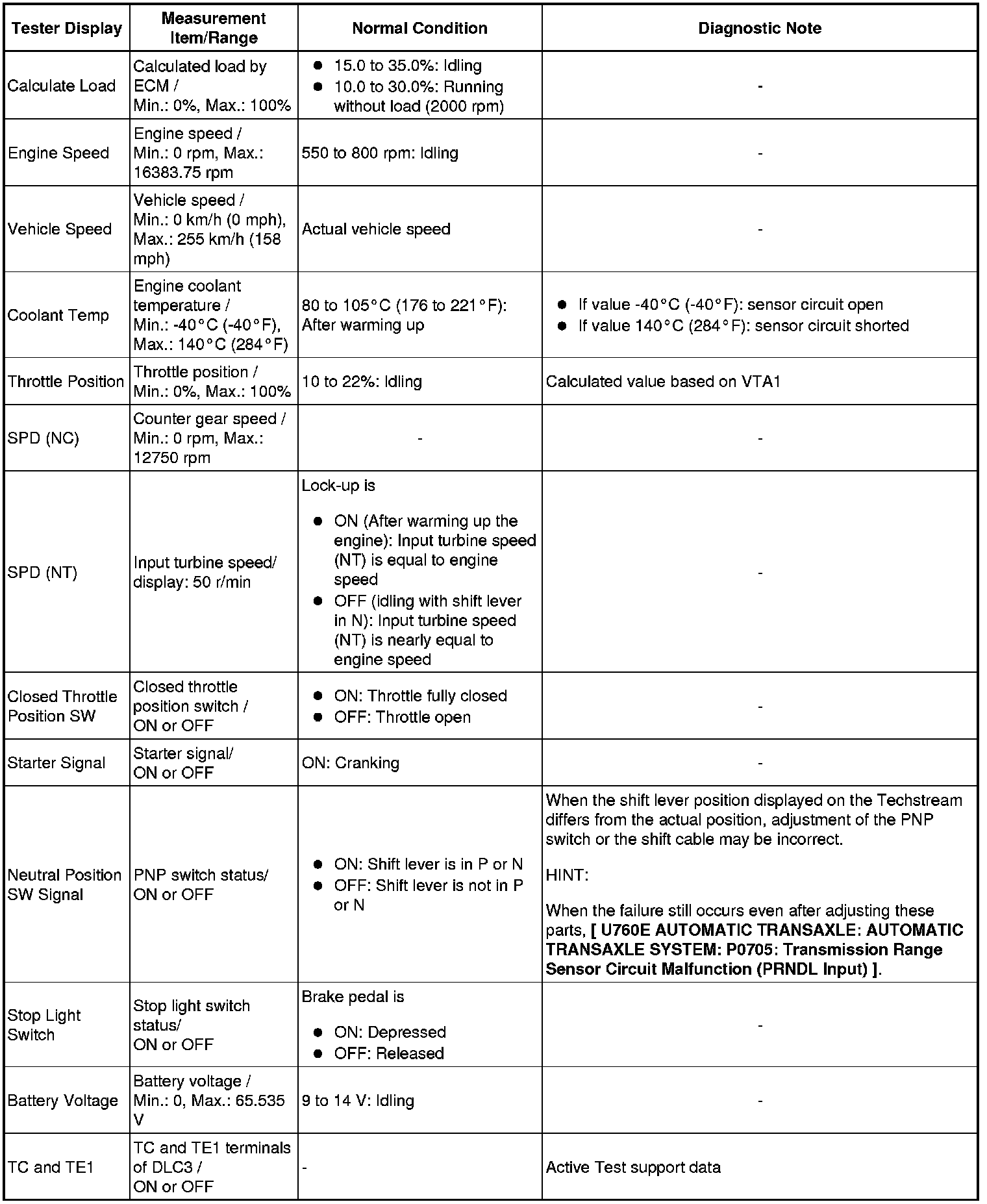 Using the Techstream to read the Data List allows the values or states of switches, sensors, actuators and other items to be read without removing any parts. This non-intrusive inspection can be very useful because intermittent conditions or signals may be discovered before parts or wiring is disturbed. Reading the Data List information early in troubleshooting is one way to save diagnostic time.