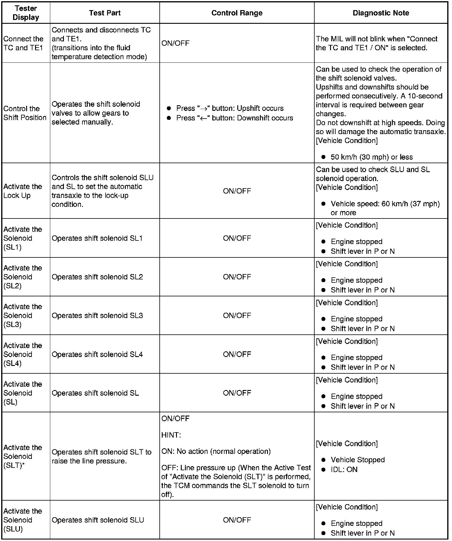 *: The "Activate the solenoid (SLT)" Active Test is performed to allow confirmation that the line pressure changes. The line pressure changes are confirmed using the same SST that is used for the Hydraulic Test Hydraulic Test.