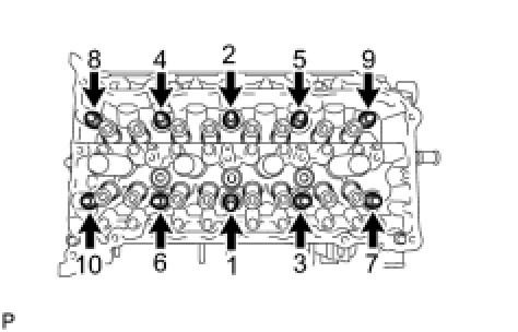 Using a 10 mm bi-hexagon wrench, install and uniformly tighten the 10 cylinder head bolts in several steps, in the sequence shown in the illustration.